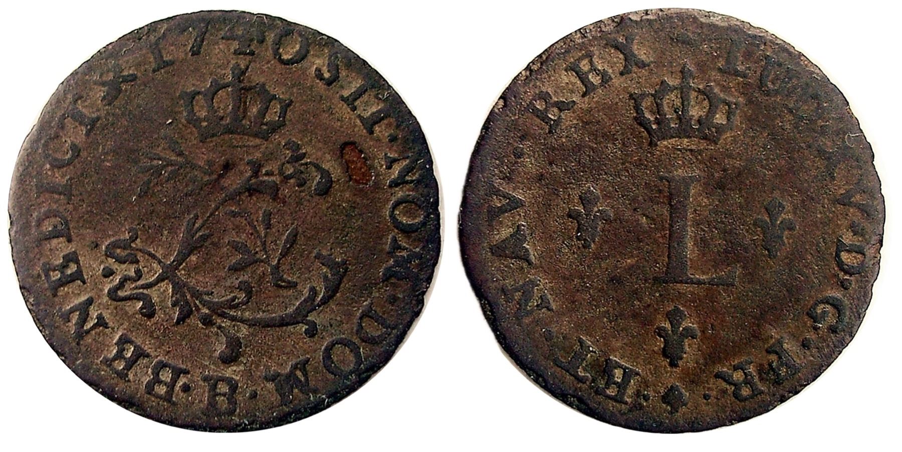 1740-B [Rouen Mint] Billon Half Sous Marques. Vlack 298. Rarity-3. Very Fine, the obverse high in that grade level. Well struck, the legends full, the date and mintmark sharp. Dark rose with ample silvering at the lower obverse and around some of the reverse legends. There is a small planchet flaw in the obverse field below the N of NOM, and a few microscopic ones on either side, the surfaces with a lightly grainy look under a glass but pleasing enough to the eye. This is the only year that the Rouen mint struck the Half Sous Marques. From the Ted Craige collection, accompanied by his original envelope.