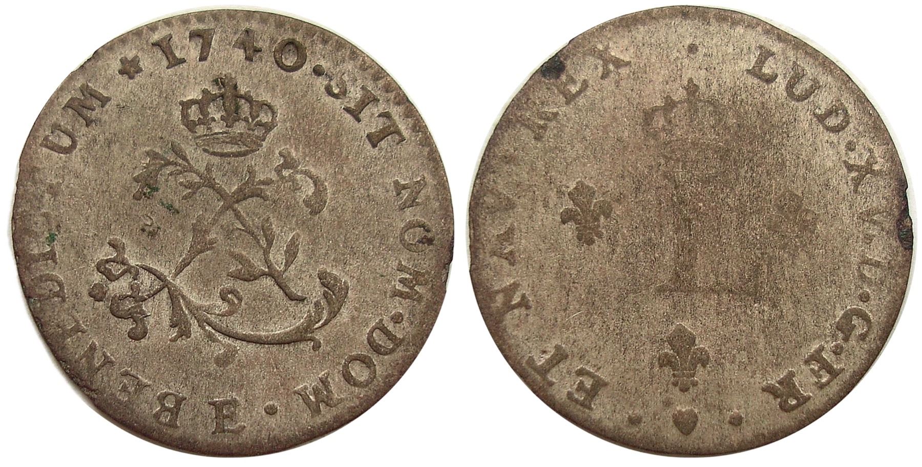 E – Tours Mint - 1740-E Billon Sous Marques. Vlack 78. Rarity-7. Very Fine overall, really an EF or better coin with a weakly struck reverse, similar in this respect to the Ford coin. The legends are bold, everything full including the date, mintmark and the charming heart different at the base of the reverse. The obverse design is strong, the crowned L on the reverse all there, but weaker than the obverse. The original silvering is nearly complete, lightly toned down – this showing the true grade of the coin as once a coin wore down past the EF level the silvering was at least partially worn away. A couple small spots on the reverse rim, otherwise nice.