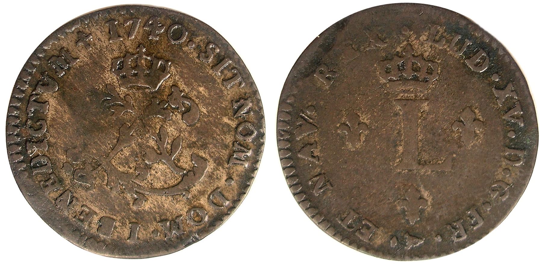 I - Limoges Mint - 1740-I Billon Sous Marques.  Vlack 116.  Rarity-6.  Very Fine, this is the Vlack PLATE COIN in his book, the only full coin illustrated in the Limoges section, and was sold in the sale of Bob’s collection as Lot 5169 where it was described as “Very Fine.  Very scarce as a date.  Somewhat mottled appearance.”  The coin is sharply struck, with just light, even wear.  The surfaces are a nice pewter hue, with much original silvering on the obverse and a smaller amount on the reverse toned down to a golden color, with a few areas of darker toning in the peripheries accounting for the mottled look.  The nicest example Vlack was able to find in many decades of collecting the series, and an important piece as a plate coin for the standard reference book.  Accompanied by Vlack’s original typed envelope and the lot ticket from the sale of his collection.