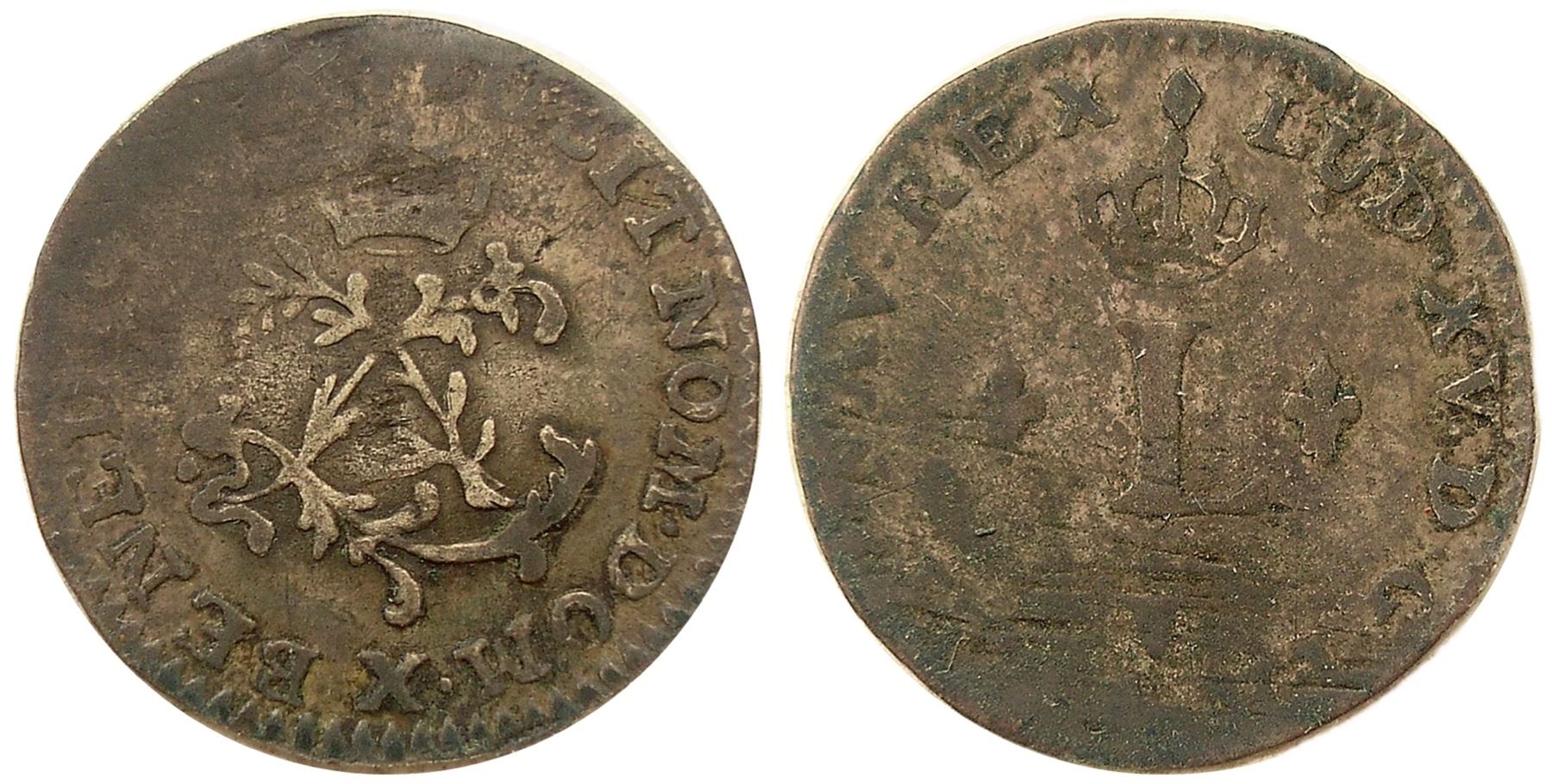 1740-X [Amiens Mint] Billon Half Sous Marques. Vlack 318. Rarity-7. Fine overall, very weak at the top obverse and lower reverse, as struck, this affecting the date – but since 1740 is the only year that Amiens struck the denomination, that is not as important, and the mintmark is strong, which is key for those pursuing a type set by mints. Light olive, much of the original silvering remaining, the reverse with some long pre-strike planchet striations across the base of that side. Not a bad looking example of this very rare mint; Ford lacked this variety.