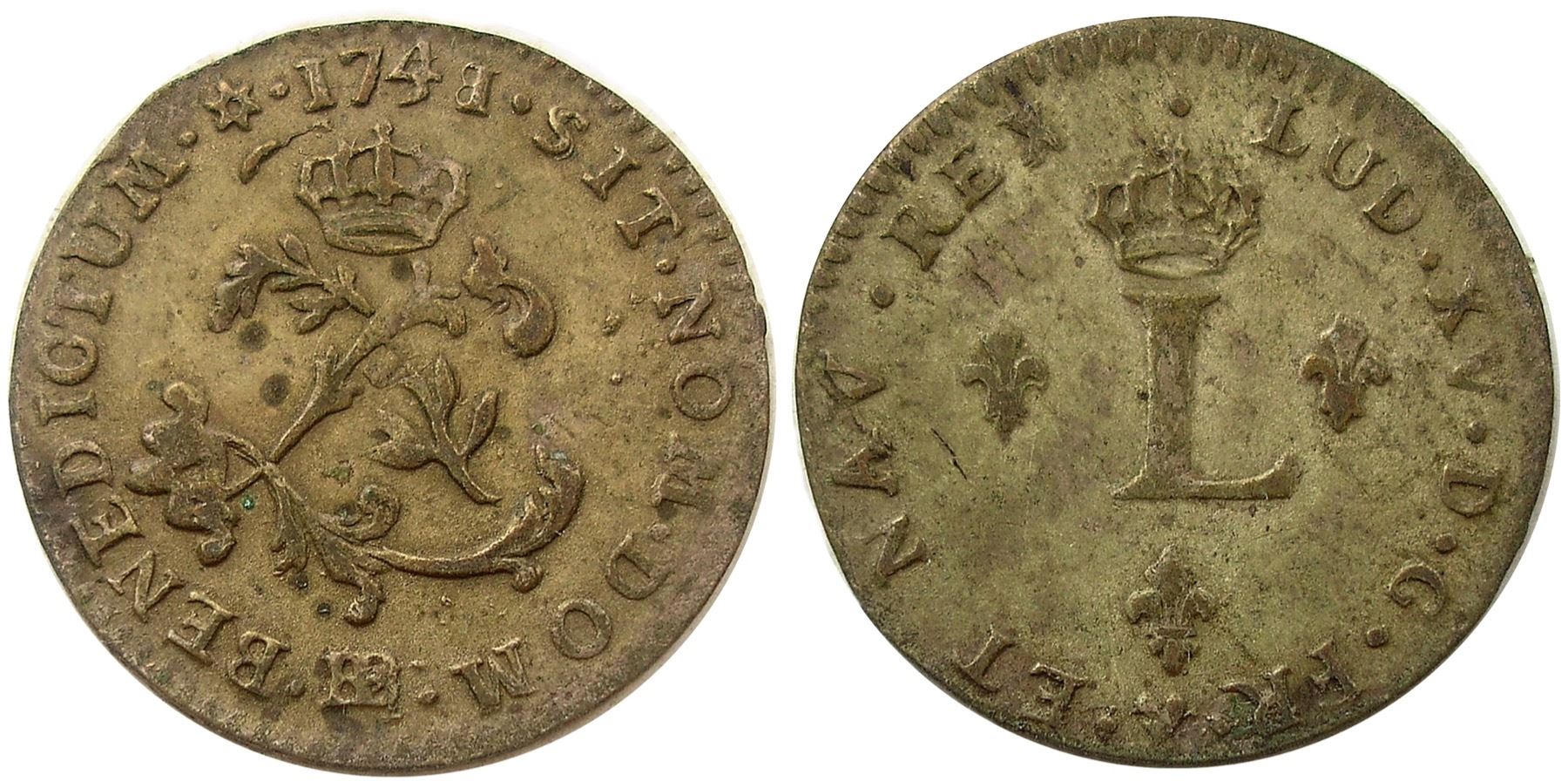 BB – Strasbourg Mint - 1741/38-BB Billon Sous Marques. Vlack 252a. Rarity-6. Choice Extremely Fine, a lovely, boldly struck example, everything razor sharp, as expected for the grade. The overdate is easily visible with the naked eye, the 3 under the 4 clear, and the 8 under the original 1 so bold it makes that last digit look almost like a backwards B! No effort was made by the engraver at all to grind down the original date, and while some overdates in the serious are quite subtle, the ones like this that are obvious are quite charming. Struck from a late die state with a notable cud under the rowel different and first digit of the date, this not seen on the Vlack example. Medium light green gold hue, the surfaces hard, with a few trivial spots and some light reverse striae, but quite an attractive coin in every respect.