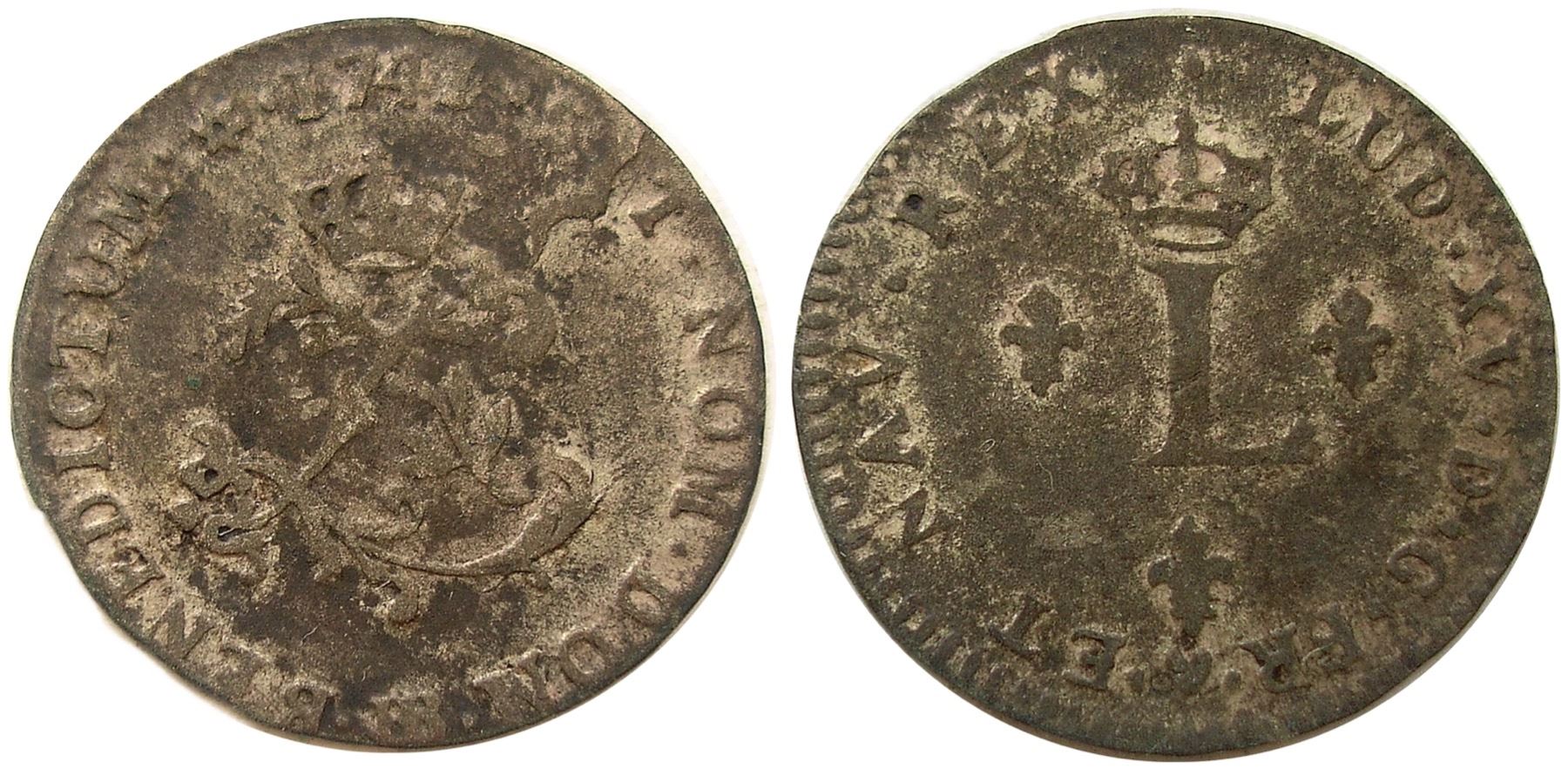 BB – Strasbourg Mint - 1741/39-BB Billon Sous Marques. Vlack 252b. Rarity-4. Very Fine, full legends on either side, save for the I of SIT which is lost to a large diebreak, a much later state than the same break seen on the Ford coin. Medium gray, the reverse with some silvering, the obverse with much more remaining, slightly grainy looking but pleasing, and quite striking with the large obverse die break.
