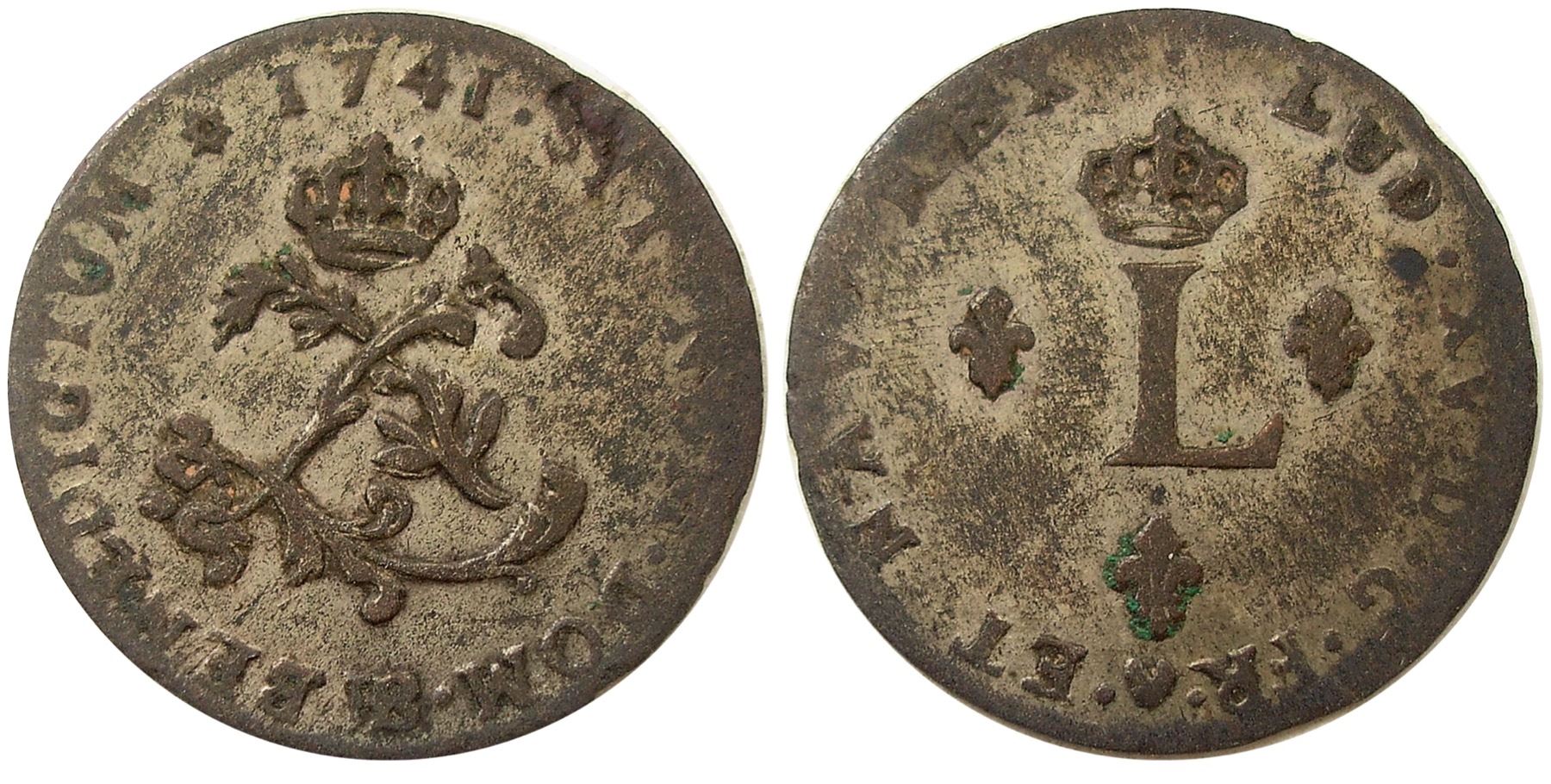 BB – Strasbourg Mint - 1741-BB Billon Sous Marques. Vlack 253a. Rarity-6. Very Fine, the tops of the letters slightly weak at the right, but everything else sharp, including the date and mintmark. Medium gray, mostly the original silvering toned down, a few light green spots on the reverse which could likely be removed, but with no major marks from circulation. A pleasing example of a rarer legend variation for this year.