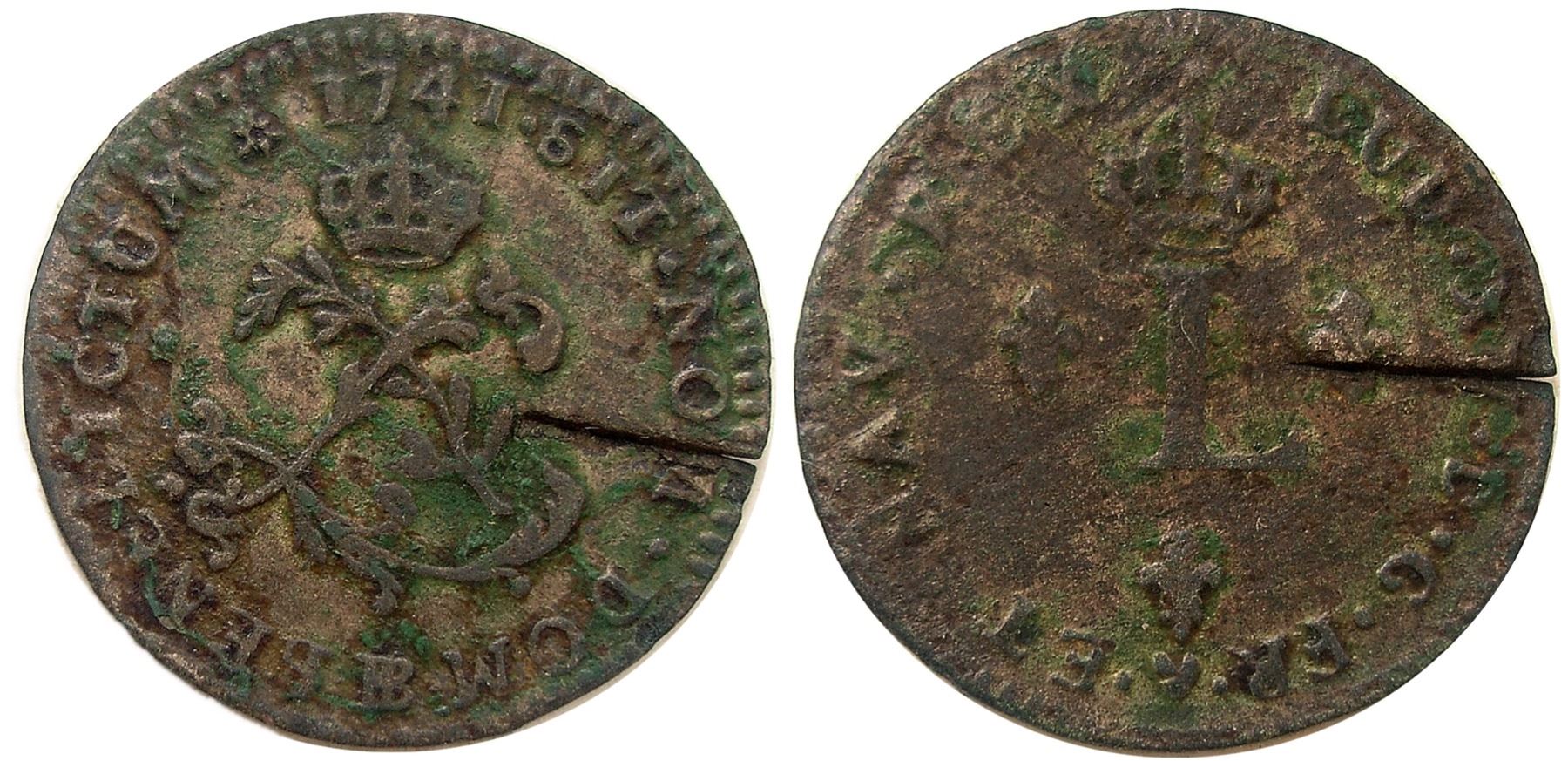 BB – Strasbourg Mint - 1741-BB Billon Sous Marques. Vlack 253b. Rarity-6. Very Fine in terms of detail, the obverse bold, the reverse less so, but with the legend full; the S in SIT on this variety was struck over an erroneous 3 that had been placed in upside down. Medium gray, the surfaces lightly rough and with a fair amount of green verdigris on either side. There is a planchet cut at the right obverse about 1/3 into the coin, visible from either side.