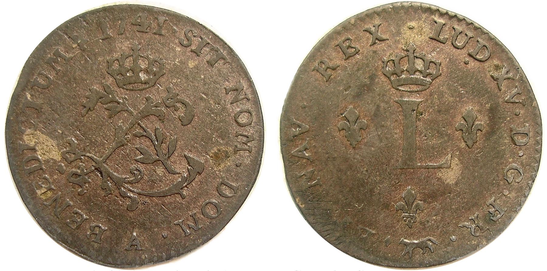 A - Paris Mint - 1741 Billon Sous Marques. Vlack 20a. Rarity-5. Very Fine, this is the Bob Vlack specimen, and appeared as Lot 5196 of the January, 2008 sale of his collection where it was called “Fine to Very Fine,” though we think it merits the full VF grade in terms of strike and wear, with the note that there is some light roughness and a few marks from circulation. This is the much rarer second semester, clearly showing the dot below the D of LUD on the reverse. A nice provenance, accompanied by the original lot ticket from the Vlack sale.