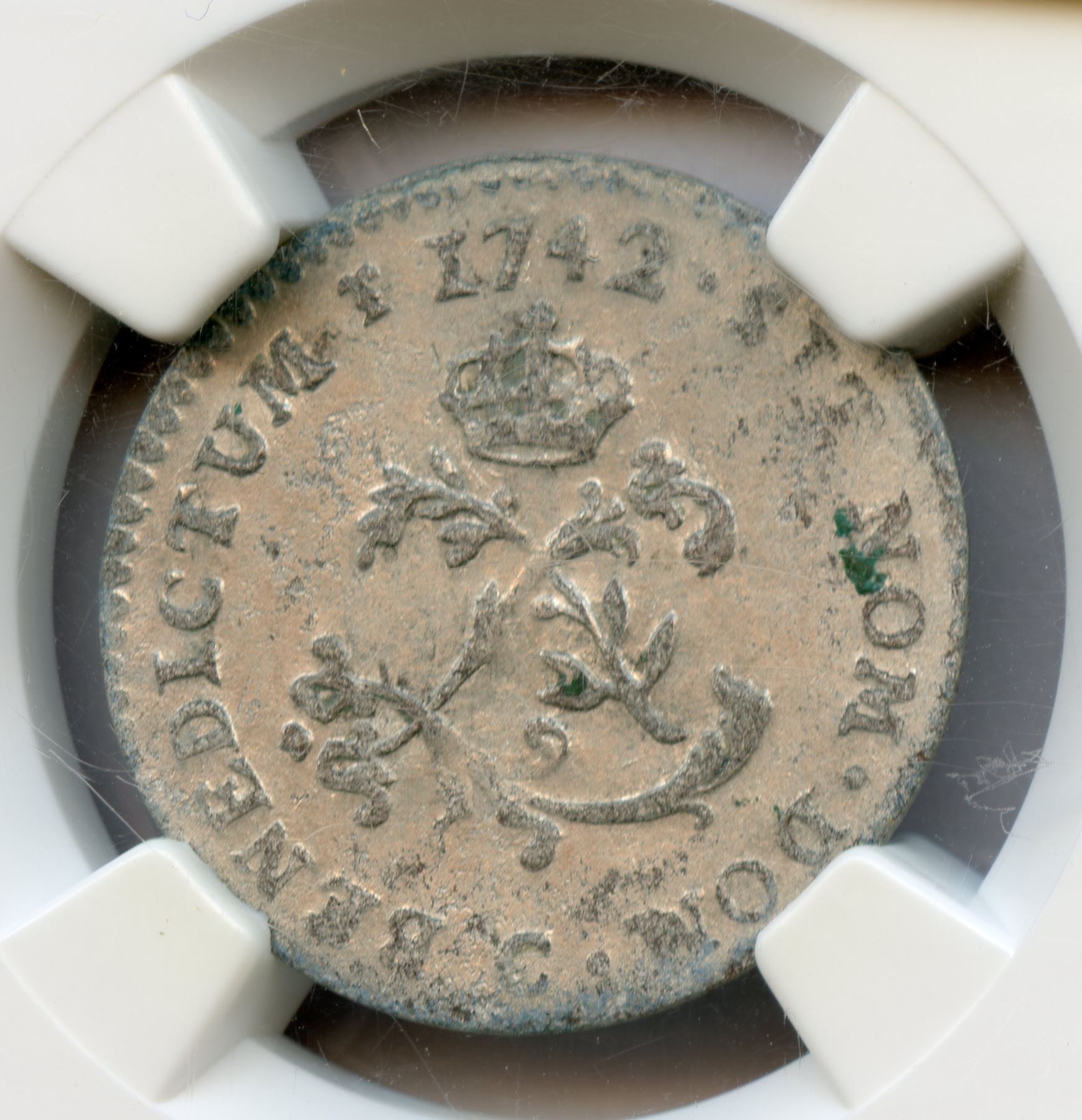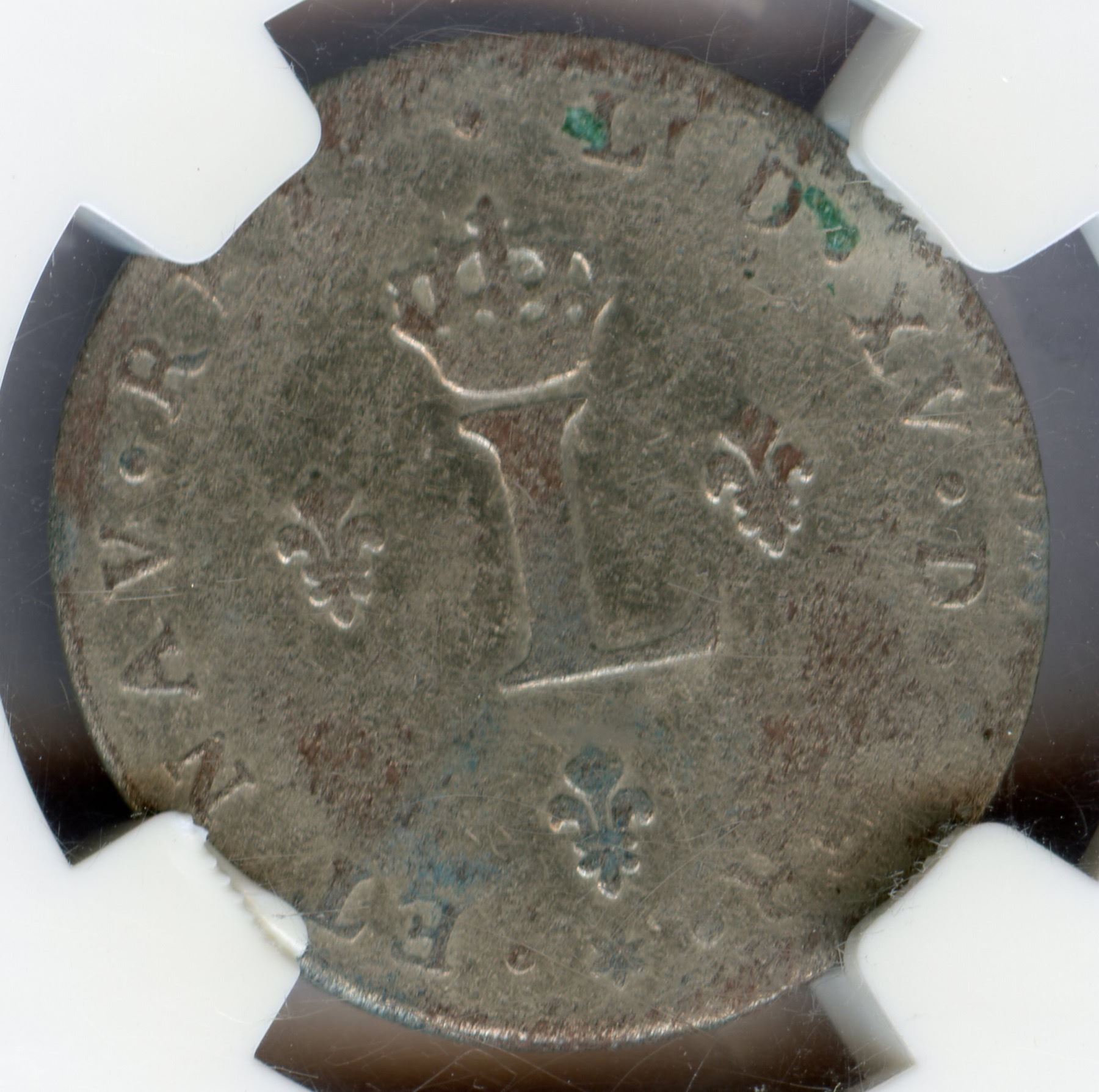 C- Caen Mint - 1742-C Billon Sous Marques. Vlack 59. Rarity-8. About Uncirculated, though slabbed as EF. Well struck overall, just the G of DG on the obverse not visible, everything else sharp, including the date and mintmark, and with strong design detail. The original silvering is nearly full, with the high points on either side and two small areas in the reverse fields that are slightly darker, this likely more from cabinet friction than actual wear, as there are no real marks or damage from circulation. A lovely example of an extremely rare variety, the only one we recall seeing that was nicer was the Vlack coin, which brought a strong $2,300 in 2008! No example of the date at all in the Ford collection, and a major find for the specialist.