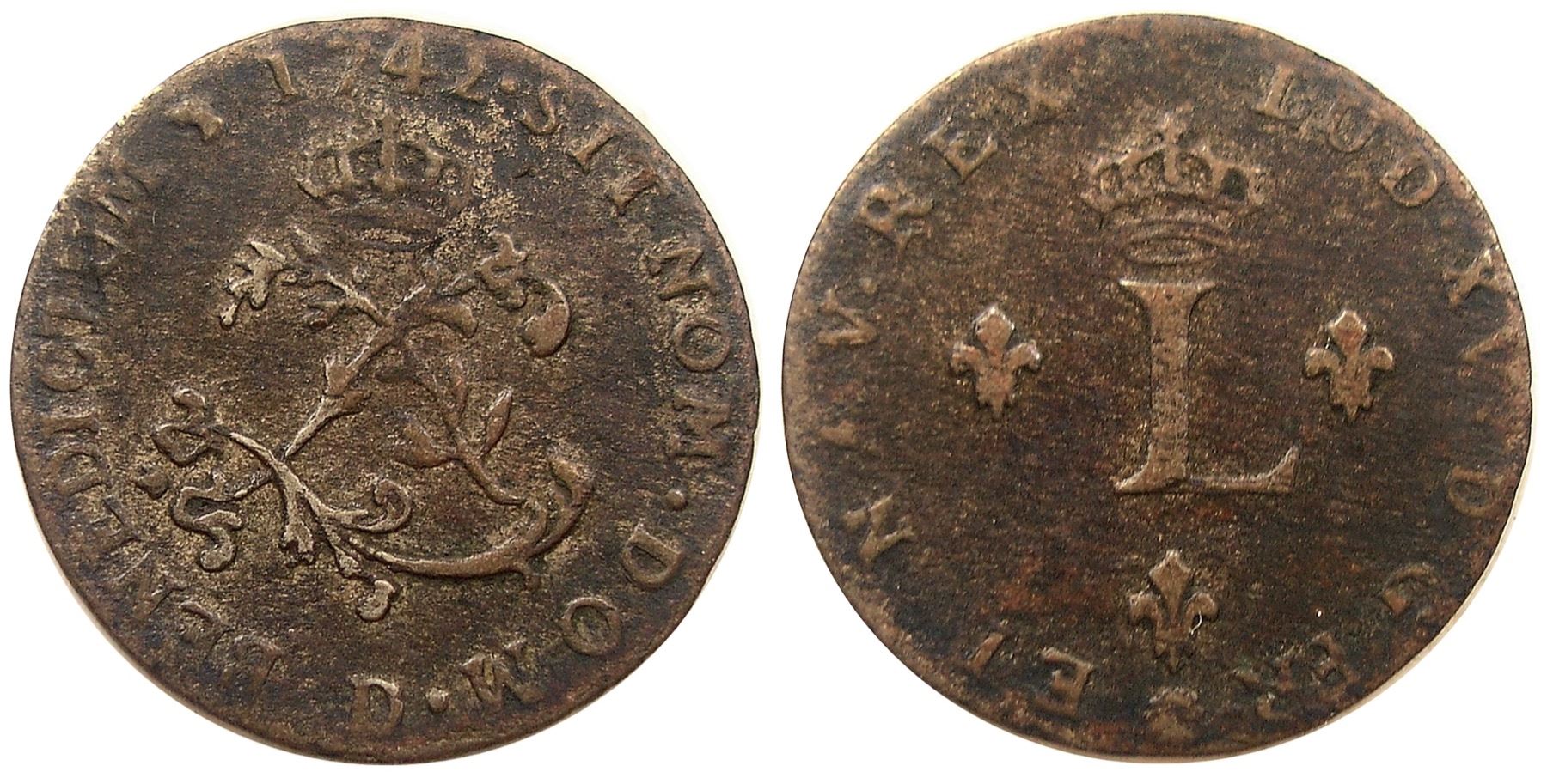 D – Lyon Mint - 1742-D Billon Sous Marques. Vlack 74. Rarity-8. Very Fine, well struck, the legends, date, mintmark and designs all sharp for the grade. Dark pewter surfaces with some original silvering adhering to the obverse design. Lightly rough, but not distracting, and few marks from actual circulation. An extremely rare variety, one that was missing from both the Ford and Vlack collections in any grade and has apparently not appeared at auction. The mintage of just under 50,000 was the smallest reported one for this mint, a rounding error to the 2.7 million that Lyon struck in 1739! That small mintage doubtless accounting for the rarity of the date today. We have no record of an example selling publicly, and collectors would be wise to take advantage of this opportunity.