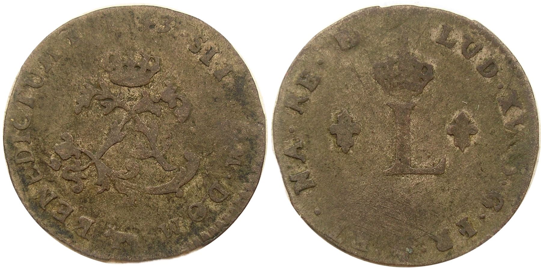 Cow – Pau Mint - 1743-Cow Billon Sous Marques. Vlack 285. Rarity-7. Nearly Very Fine, well-struck for this mint, though some areas are weaker than others. On the obverse NO of NOM is weak, as are the first two digits of the date, the rest reasonably sharp, the distinct cow mintmark bold at the base of the obverse. The legend is full on the reverse, a few letters slightly weaker than the rest, but all there. The Pau Mint issues are curious in that the reverse dies starting in this year leave the V off of NAV, abbreviating that word as NA and the legend doesn’t end with REX, like all the other mints, but rather with RE . B, that final letter a monogram, but Vlack doesn’t say of what, or discuss its relevance – a mystery for some intrepid researcher to untangle! Light olive color, some original silvering present on either side, the surfaces with a light graininess but much better than normally found for a Pau mint issue. The edge a bit chipped at the base of the obverse, but no real damage. The Vlack coin was called VF and rough and flawed, though we thought it nice – and the audience agreed as that coin, which received just a two-line description soared to over US $2,000. That example is the only other one we have seen at public auction, and this rarity will surely be contested by specialists.