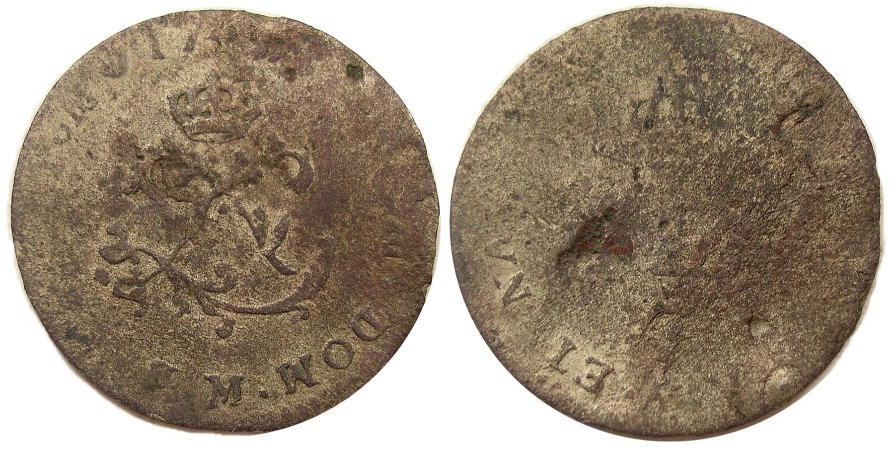 M – Toulouse Mint - 1743-M Billon Sous Marques.  Vlack 147.  Rarity-8.  Fine/Very Good, the reverse weaker than the obverse, as struck.  Somewhat indifferently struck, the obverse legend missing SIT and much of the inner letters of BENEDICTUM, the mintmark bold, the date weaker, but visible, and the crowned L design sharp.  The reverse is weaker, with just ET NAV strong and traces of other letters visible, the central design weak but at least partially visible.  Light gray, much of it toned down original silvering.  The surfaces lightly rough, and with a few planchet flaws, the largest where the left fleur-de-lys would be on the reverse.  The collector holding out for a choice Toulouse Mint Sous will likely be left waiting – the few examples that have survived seem to be in nearly all in lower grades. We note that the weakness on this coin is the same as seen on the Vlack collection piece, so the mint was certainly turning out poor quality product in this, the next-to-last year it minted Sous.