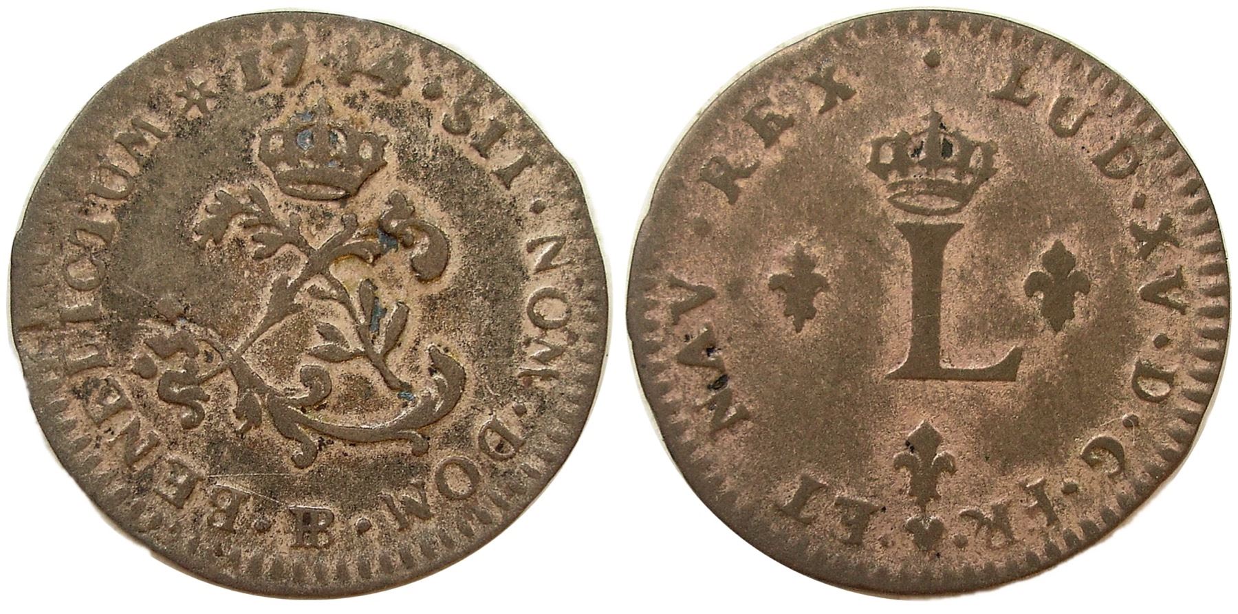 BB – Strasbourg Mint - 1744/3-BB Billon Sous Marques. Vlack 257c. Rarity-8. Choice Very Fine, a pleasing example of this extremely rare variety. Well struck on a broad planchet that shows most of the denticles on either side. The legends are bold, the 4/3 overdate matching up to the enlarged photo in the Vlack book. Lovely light gray in the fields, with much of the original silvering remaining on either side, around the devices and legends on the obverse and more prevalent on the reverse. No real marks or damage other than light wear, and a stunning example on its broad planchet. Quite rare, but present in both the Vlack and Ford collections – the latter called Unc but not plated in the sale, though perhaps it should have been since it brought $2,760 in spirited bidding!