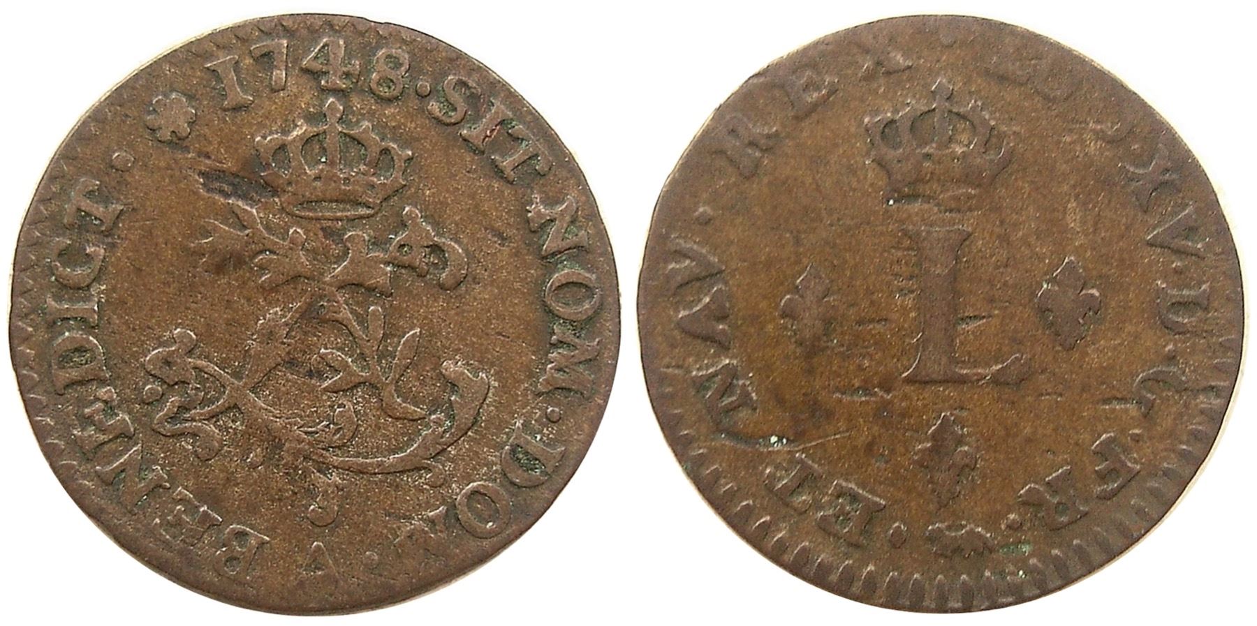 1748-A [Paris Mint] Billon Half Sous Marques. Vlack 297. Rarity-6? Very Fine, nicely struck with the obverse legend bold, the reverse one full but just a bit weaker at the top; the date is sharp, the mintmark weaker but visible, the design details strong. Light brown, looking for all the world like a copper planchet, with just a faint trace of original silvering visible in the obverse design, quite unusual as most examples are well-silvered (such as the Vlack coin), and we don’t recall seeing one with this much of a copper look. The planchet has a small pre-strike flaw to the left of the crown on the obverse, and a few smaller striae, but the surfaces are surprisingly hard and the overall effect is quite pleasing. Vlack calls this issue a Rarity-2 in his book, which is surely a typographical error! This late date – the last year Paris mint coined the series, a good half decade past any other mint – shows up only infrequently, and just a fraction of the time one sees the common 1740-dated Half Sous, which Vlack called Rarity-3. It is likely that this was a typo and R-7 was intended, though we suspect that today the variety would be considered a full R-6. None in the Ford collection in any grade.