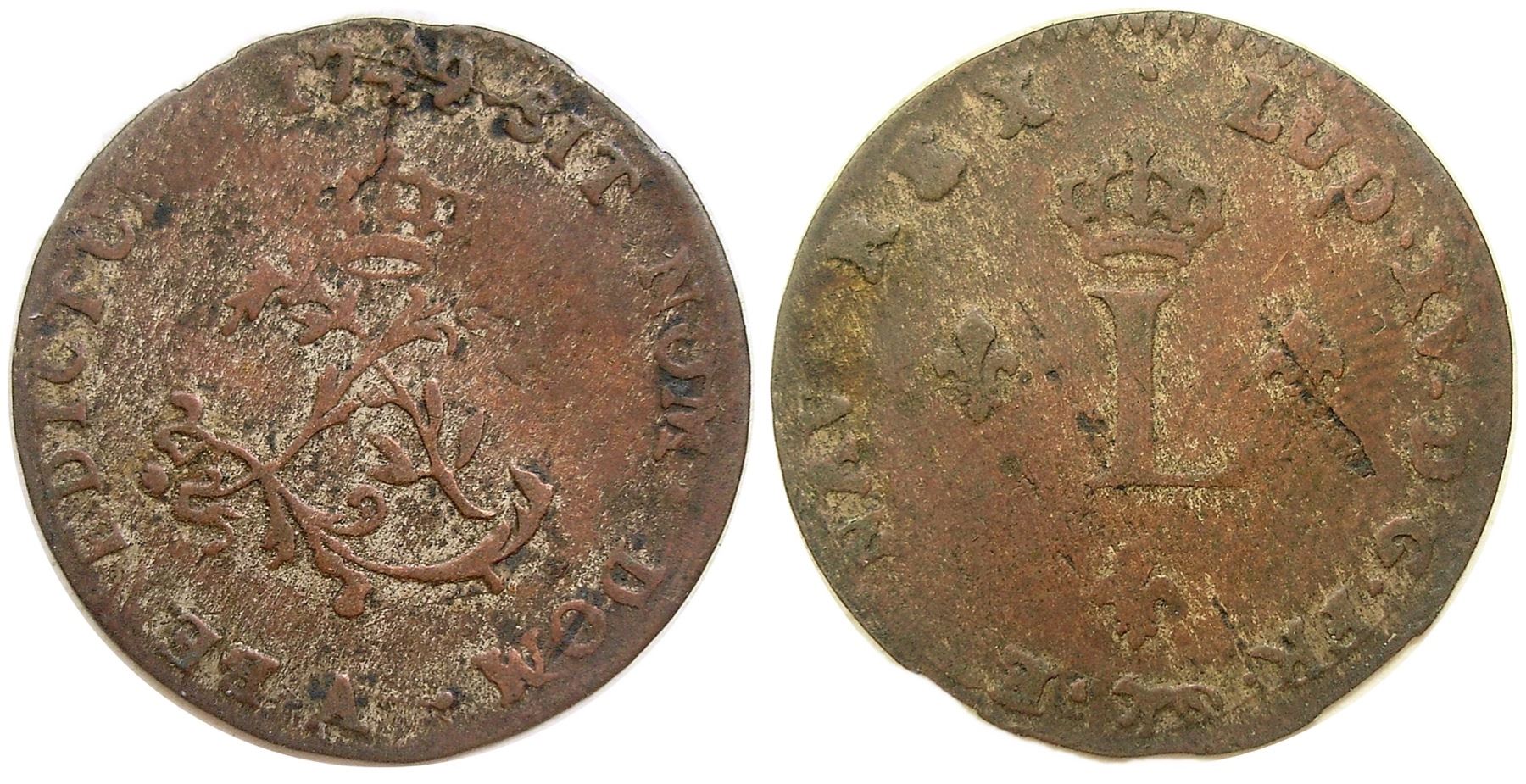 A - Paris Mint - 1749/8-A Billon Sous Marques. Vlack 29b. Rarity-7. Nearly Very Fine, a well-struck example, with just a single letter weak on either side, the final one on the obverse and the T of ET on the reverse, the date sharp, clearly showing the long diebreak through it, an easy match to the enlarged photograph in the Vlack book. Very light pewter color, with ample original silvering around the legends and devices, the surfaces mostly hard, with some reverse striations that were in the planchet before the coin was struck. The Vlack coin was marginally sharper on the reverse, but was heavily scratched, and there was no example of this overdate (or date) in the Ford sale. A pleasing example of a very rare variety.