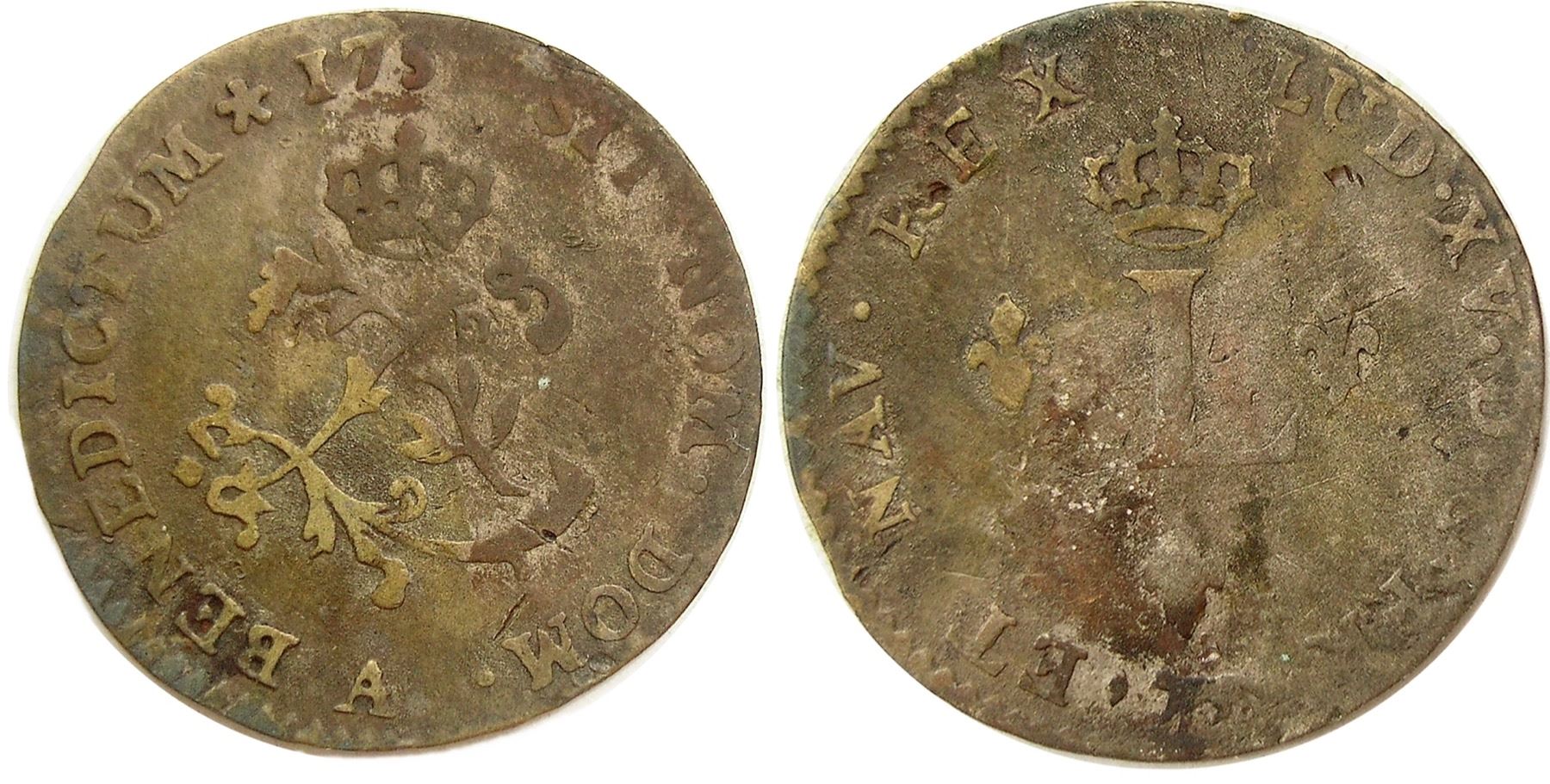 A - Paris Mint - 1751-A Billon Sous Marques. Vlack 31. Rarity-6. Nearly Very Fine, slightly weaker at the upper right obverse, the legends there a bit softer than the rest, the remainder of the legends, date and mintmark all sharp, as are the obverse design details, while the central reverse is a bit weaker than the rest. Light golden toning with some original silvering still evident. The reverse has some light planchet striae, some darker toning at the bottom, and a few marks from circulation consistent with the grade. A rare variety, Ford’s Choice AU brought $1,610 over a dozen years ago.