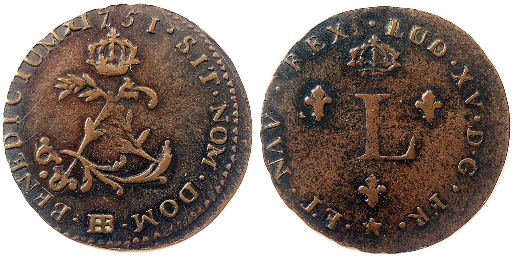 BB – Strasbourg Mint - 1751-BB Billon Sous Marques. Vlack 368. Rarity-4. Choice Very Fine, a pleasing example of this contemporary counterfeit issue, struck slightly off center to the base of the obverse and upper reverse, with a nice set of crudely engraved dentils at the upper obverse, and showing that there were no such dentils ever engraved on the reverse die. This variety was struck on copper planchets which had been silvered, the present example a lovely light golden brown with ample traces of the original silvering within the peripheral legends. The planchet is out of round, as made, adding to the crudeness of the coin. From Bob Vlack, a duplicate from his collection purchased privately, accompanied by his original typed envelope. The contemporary counterfeits are highly collectible, and they range from extremely common to extremely rare – just as they range from laughably crude to exceedingly well made. This is a lovely example.