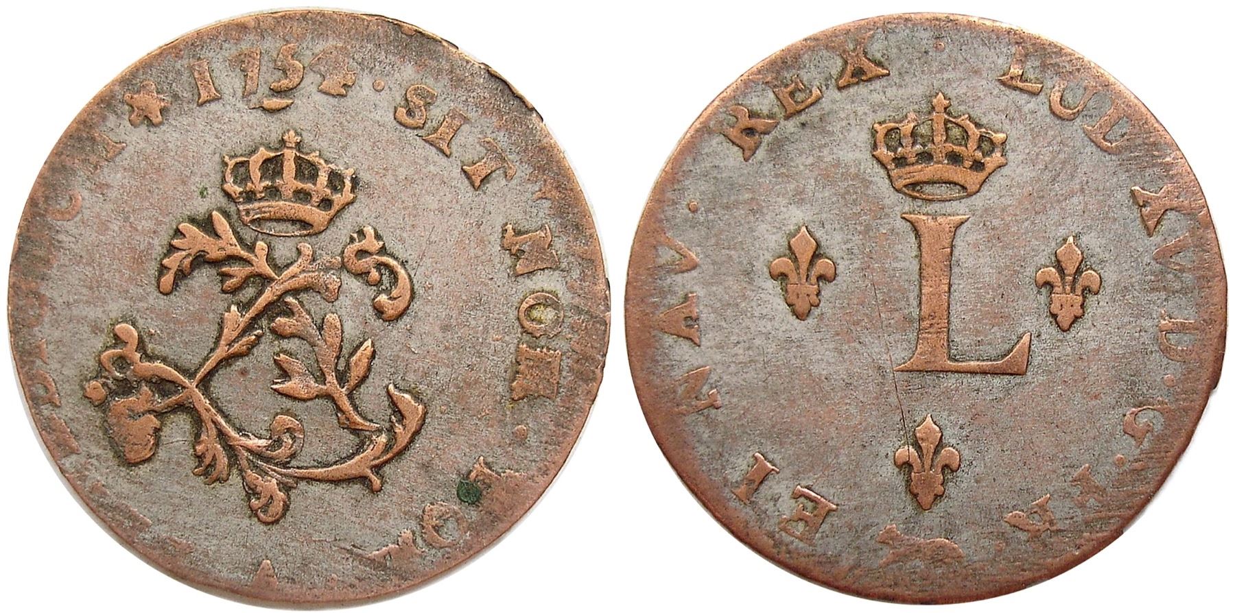 A - Paris Mint - 1754-A Billon Sous Marques. Vlack 34. Rarity-7. Very Fine, the obverse struck slightly off center, pushing the tops of the legends at the left off the planchet, the legends on both sides a bit weak as well, though the central details are bold. A neat diebreak below the 75 in the date looks like a leaf. Substantial silvering on either side, the coin likely cleaned in the past as the metal showing through in the areas where the silvering is worn is a pinkish hue; this will tone down over time and the coin will look fully natural. A few light marks from circulation, including a couple hairline scratches, but not that bad. A rare variety, this first semester strike much rarer than those from the second.