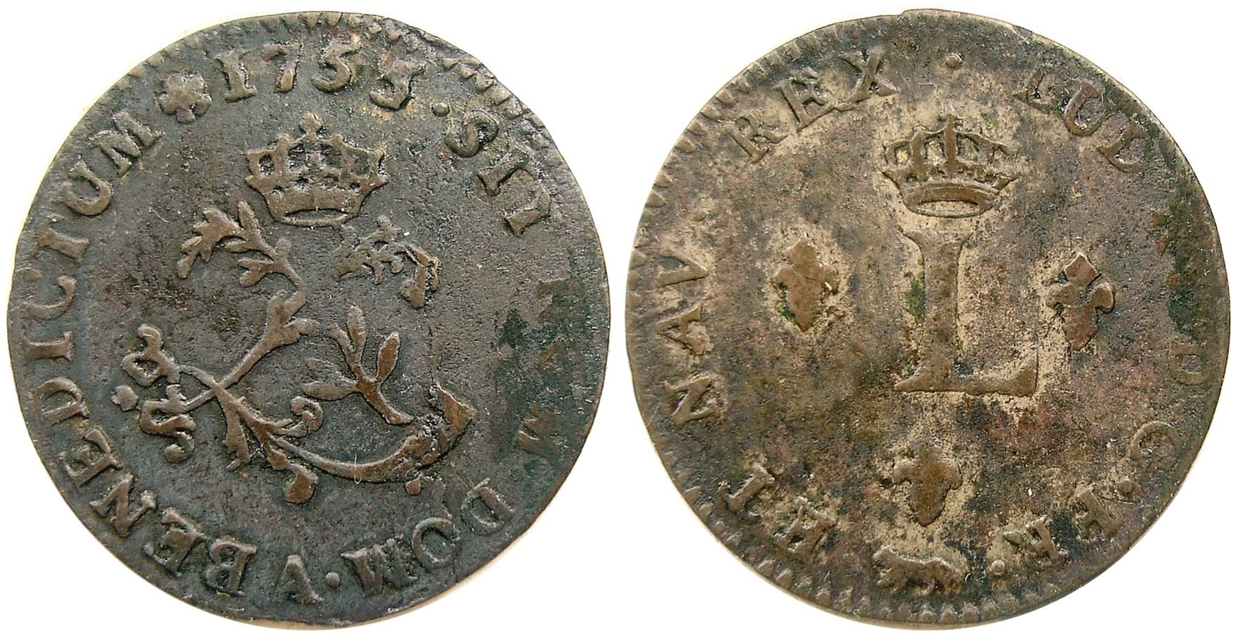 A - Paris Mint - 1755/4-A Billon Sous Marques. Vlack 35c. Rarity-7. Very Fine, most details high in that grade level, the three letters at the extreme right of either side weaker, but visible; the rest of the legends sharp, and the overdate strong. Nice design detail on either side. The obverse is a light pewter color with some darker hue at the right, the surfaces hard to the eye but with some light striae visible with a glass; the reverse has a fair amount of original silvering around the legend and design. An attractive example of a very rare issue – while the John Ford collection contained one, the Vlack collection did not, the only listed variety of genuine 1755-A coinage that he actually lacked!
