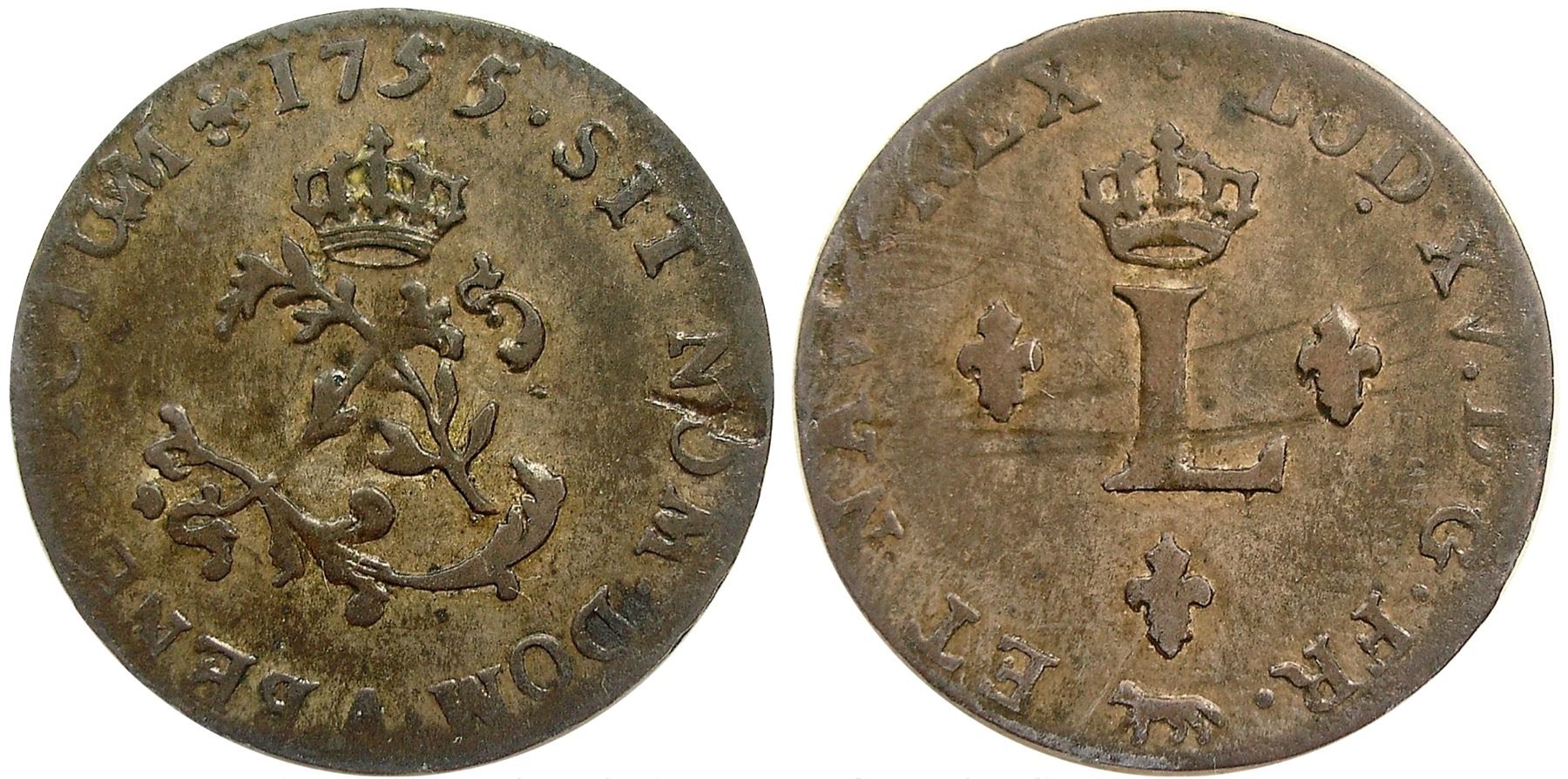 A - Paris Mint - 1755-A Billon Sous Marques. Vlack 35a. Rarity-4. Very Fine, another example from the Bob Vlack collection, appearing as Lot 5346 in the sale of his collection, described there as “medium gray color, toning lines across the reverse.” The legends are full on either side, the individual letters strong save for those at the extreme left of either side, which are weaker but still visible. The surfaces are hard and a pleasing color. The 1755-A type is often encountered, but the vast majority of specimens for this date are actually contemporary counterfeits (Vlack 346-351, with the Vlack 350 variety the most commonly found); genuine examples of this date are actually quite scarce – of the four varieties that Vlack lists, this is the most available, the other three called Rarity-7. Accompanied by the original lot ticket from the Vlack sale, as well as his distinct typed envelope.