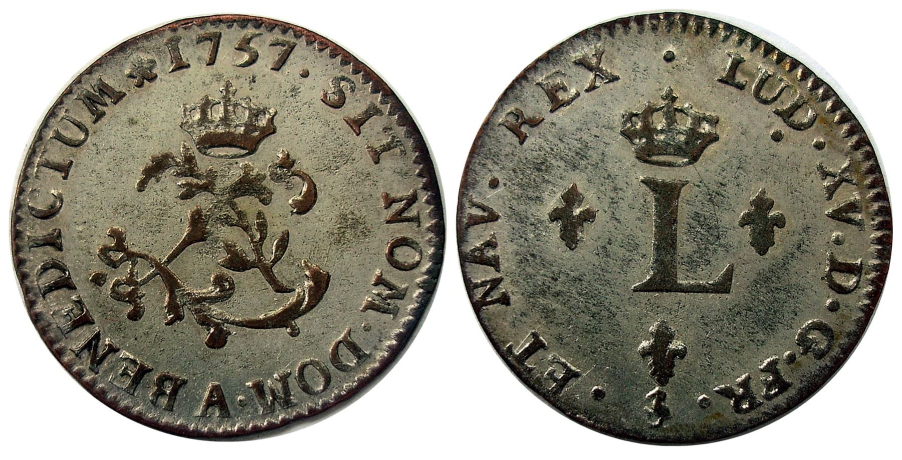 A - Paris Mint - 1757-A Billon Sous Marques. Vlack 41a. Rarity-7. Choice About Uncirculated, a piece that likely saw no active circulation and the light rub on the high points of either side a result of cabinet storage for a couple centuries. A really lovely coin, boldly struck, the surfaces hard and with vibrant original silvering over the fields; the lightly rubbed high points showing the darker toned billon hue, which gives a nice contrasting look to the coin. No real marks or damage from circulation, and a coin that has all the appearances of being saved by collectors from the time it was minted. The mint director changed during the 1757 calendar year, and the new director Jean Dupeyron changed the fox different of his predecessor to a heron; there were two major types of punctuation with this mark, one with a dot between the heron and ET, one without. An exceedingly rare variety – there was no example in any grade in either the Ford or Vlack collections, the latter quite amazing since he had the largest collection formed to that time. This is a special coin, combining condition and rarity, and we expect collector interest when it crossed the auction block.