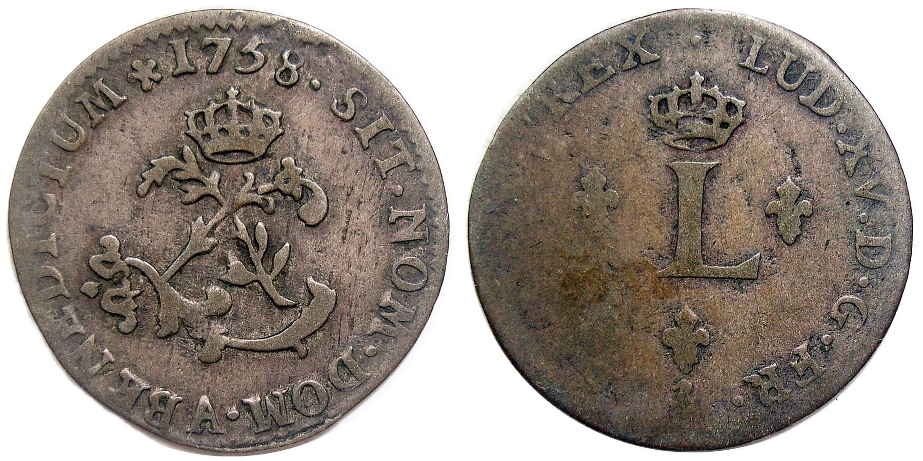 A - Paris Mint - 1758-A Billon Sous Marques. Vlack UNLISTED. Rarity-8. Very Fine, weak at the lower right reverse, with ET NAV lost there, the remainder of the legend full, the letters all sharp, as are the date and mintmark. This is an UNLISTED variety and has been given the designation of Vlack 39g; it features a stop SIT and NOM on the obverse, where the Vlack 39 type has no stop there (confirmed by the three examples of that variety in the Ford and Vlack auctions, none of which show a stop). The Vlack 42a variety for this date does have a stop after SIT – but that variety also has a stop between the heron and ET and is from the second semester, whereas this is clearly a first semester piece. None of this variety in Ford or Vlack, and we have records of just one other example, in a prominent private collection. A very rare opportunity for the specialist.
