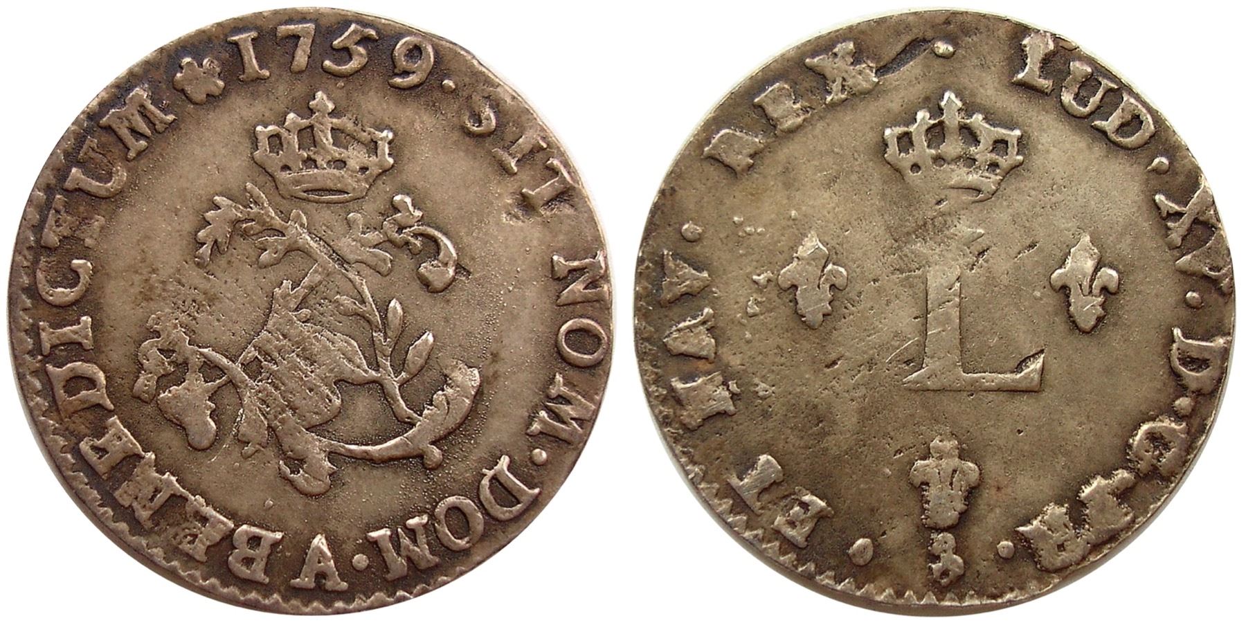 A - Paris Mint - 1759/8-A Billon Sous Marques. Vlack 43b. Rarity-6. Very Fine, a rather sharply struck example, and the Vlack PLATE COIN for this overdate; it appeared as Lot 5378 of the sale of Vlack’s collection, where it was undergraded as Fine, though clearly much sharper than that grade. The cataloguer noted that the piece was “a bit rough in places but with nice light silver color.” The roughness is actually light striations that were in the planchet prior to the piece being struck. Both dies are in late states, with some crumbling in the legends and fields, and with light die spalling visible at the bottom of the obverse design; the reverse state is especially late. For dies that were in such a state of damage it is actually amazing that this coin looks as nice as it does! Accompanied by Vlack’s original typed envelope and the lot ticket from the sale of his collection.