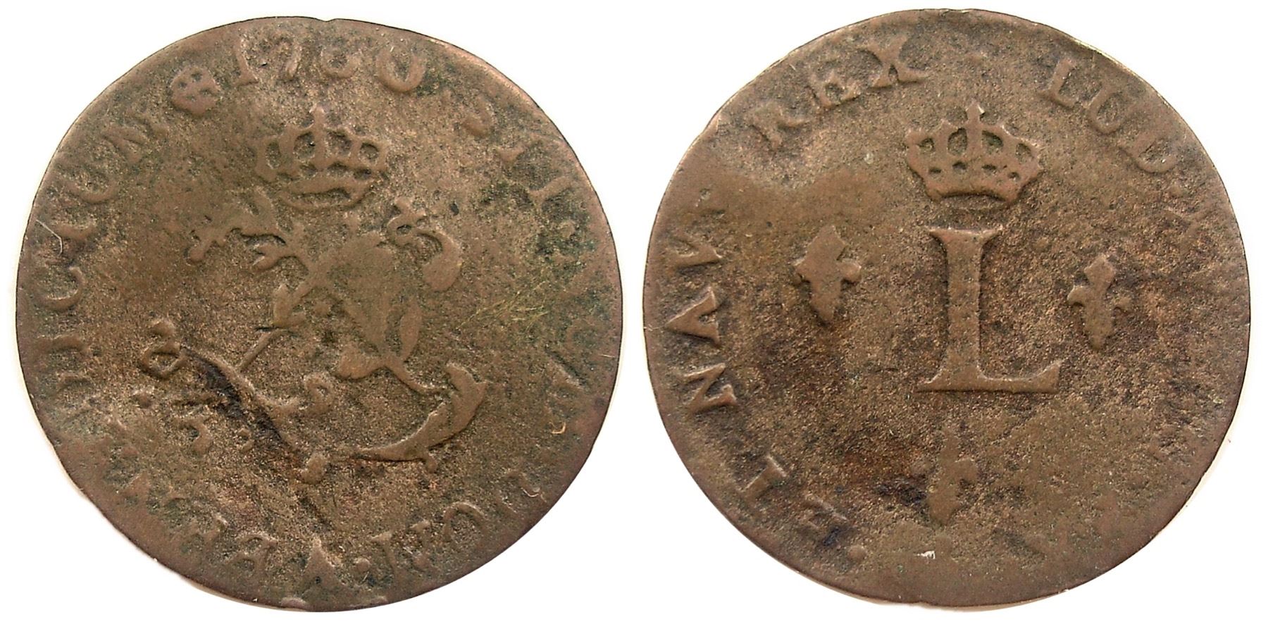 A - Paris Mint - 1760-A Billon Sous Marques. Vlack 44c. Rarity-8. Fine or so. The legend full save FRAN on the reverse, the obverse clearly showing the stop after SIT, which is only found on this variety for the date. Light gray with some darker mottling, the surfaces with a light roughness and some light striae on the obverse, but overall attractive for a circulated coin. An extremely rare variety, the only specimen that has appeared at auction is the Vlack coin, a slightly sharper VF specimen; none in the Ford collection. In these later dates only a couple mints were striking the Sous Marques, and most of those years are fairly rare.