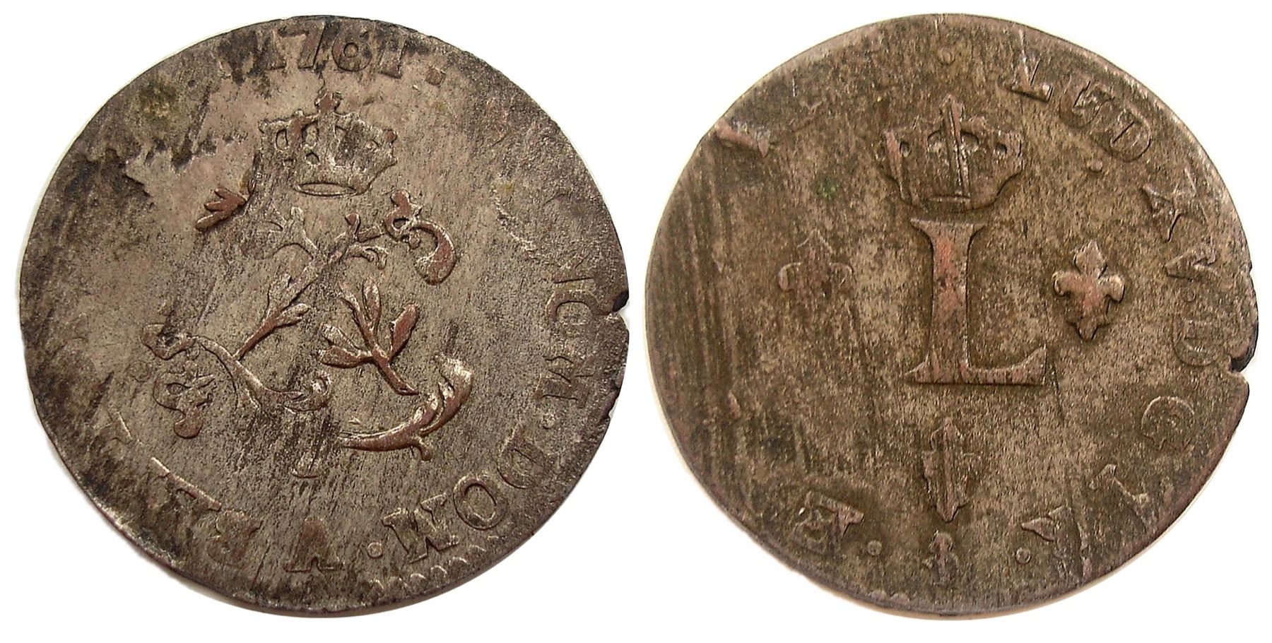 A - Paris Mint - 1761-A Billon Sous Marques. Vlack UNLISTED. Rarity-8. Fine, overall. This variety, which will be called Vlack 45d was unlisted in Vlack’s book, but was found by him after it went to press. This is the discovery example, and appeared as Lot 5387 of the sale of his collection, where it was described as “an interesting specimen dated 1761-A and with large, thick letters and numerals; the piece does not show a stop after G on the reverse and so is unlisted in Bob’s catalog (it might be named 45d). Medium gray color with coppery red showing through on the high points, some surface problems.” Those problems are planchet striations, more visible on the reverse, and these were there before the coin was struck, as was a small edge chip at the right obverse. The 1761-A issues are quite rare, of the four varieties that Vlack lists one is a Rarity-6 and the other three are Rarity-8, with this new variety added to the Rarity-8 group. Accompanied by Vlack’s original typed envelope and the lot ticket from the sale of his collection. We have record of just one other specimen of this variety, so a rare opportunity for the specialist indeed.