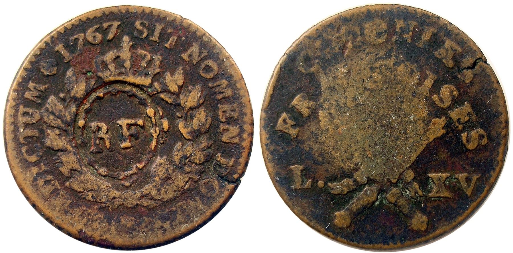 1767-A French Colonies Copper Sou. Vlack 5-E (E), with the RF countermark. Fine or so, the countermark flattening out a few letters at the reverse area opposite, as is always the case, the rest of the legends mostly there, ranging from weak to strong, with just a few letters lost at the base of the obverse. Medium brown with lighter golden highlights, a small planchet crack at the lower right obverse edge. The entire Vlack article on these was reprinted in the December, 2001 issue of The Colonial Newsletter, which includes line drawings of the 15 different countermark punches Vlack was able to identify.