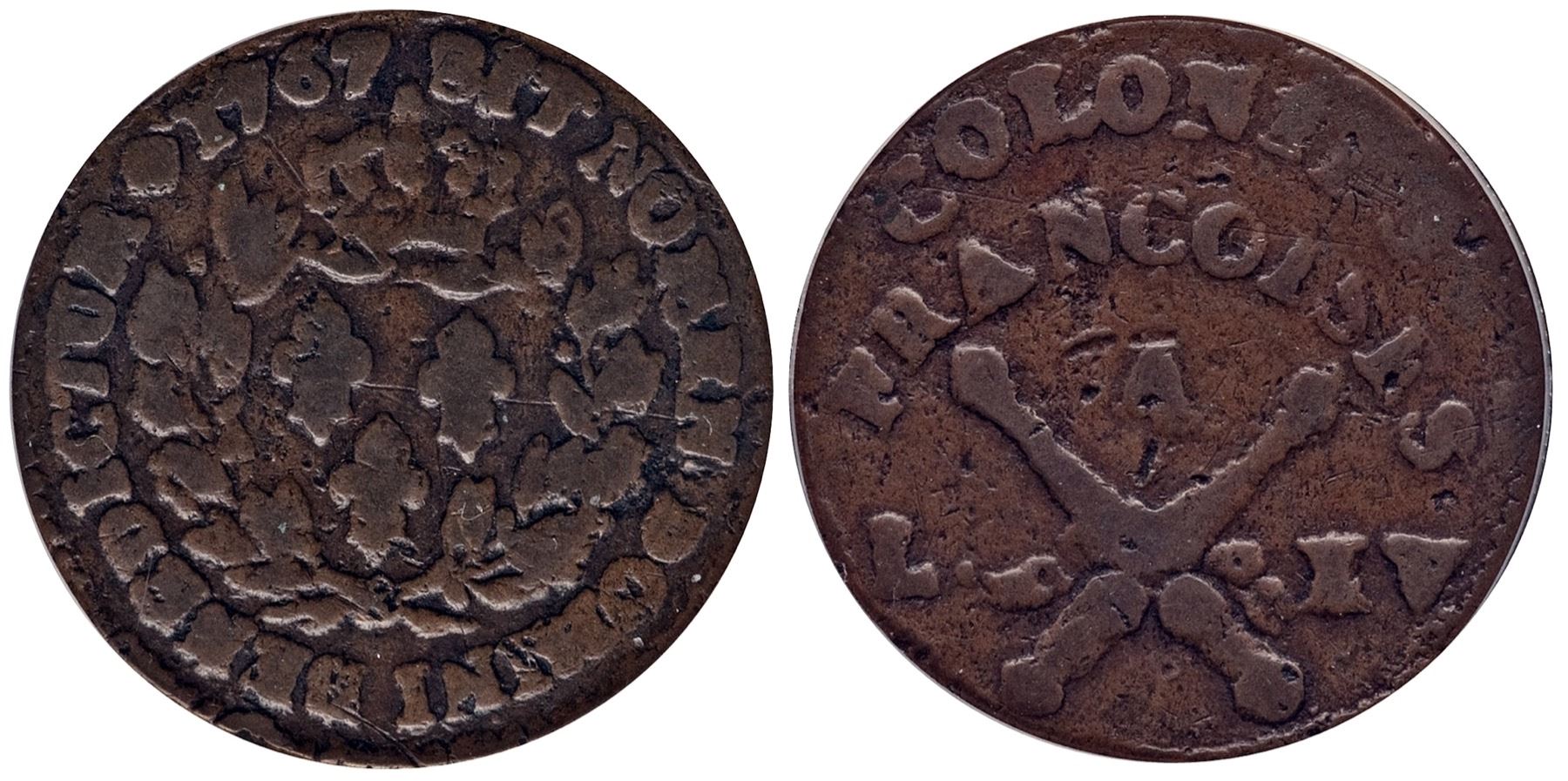 1767-A French Colonies Copper Sou. Vlack 7-N, without the RF countermark. Fine, in an ANACS holder graded F12. The legends are full, IES of COLONIES weaker on the reverse and just partially visible, the remainder of the legends all bold. Light russet brown, the surfaces hard enough to the eye, the planchet with some light roughness from tiny striations in the copper, and either side with some marks from circulation, including an obverse scratch that has toned down to the surface color. A very rare variety, from the Philip Keller collection, purchased in 1976 from David Sonderman who was the second dealer in the United States to specialize in colonial coins, after Richard Picker; accompanied by Keller’s original envelope.