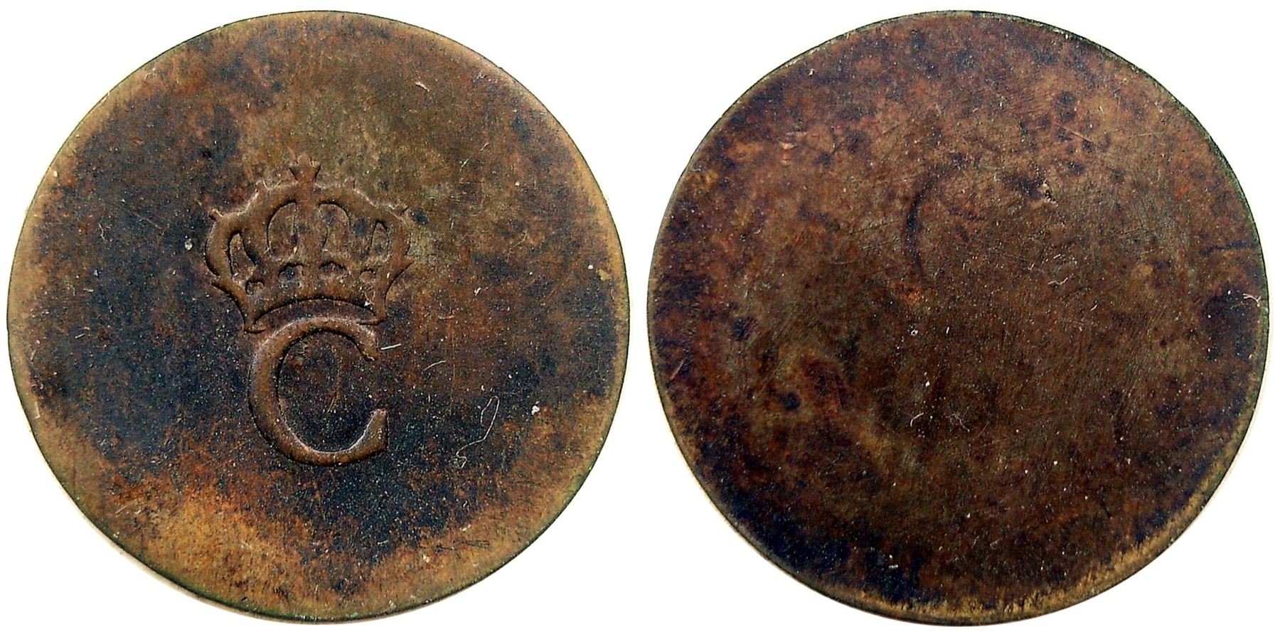 1779 French Colonies Stampee, Struck on a blank copper planchet. Vlack 375. Rarity-2. Very Fine, a type that is really impossible to grade since there was little to wear down, just the Crowned C countermark, and everything else blank, and on this planchet stock the countermark is usually quite sharp. Mottled medium brown and tan, some light roughness but no real damage. The supply of earlier Sous Marques were depleted by 1779, and in that year the Paris Mint began to strike the Crowned C mark onto blank planchets, as seen here.