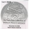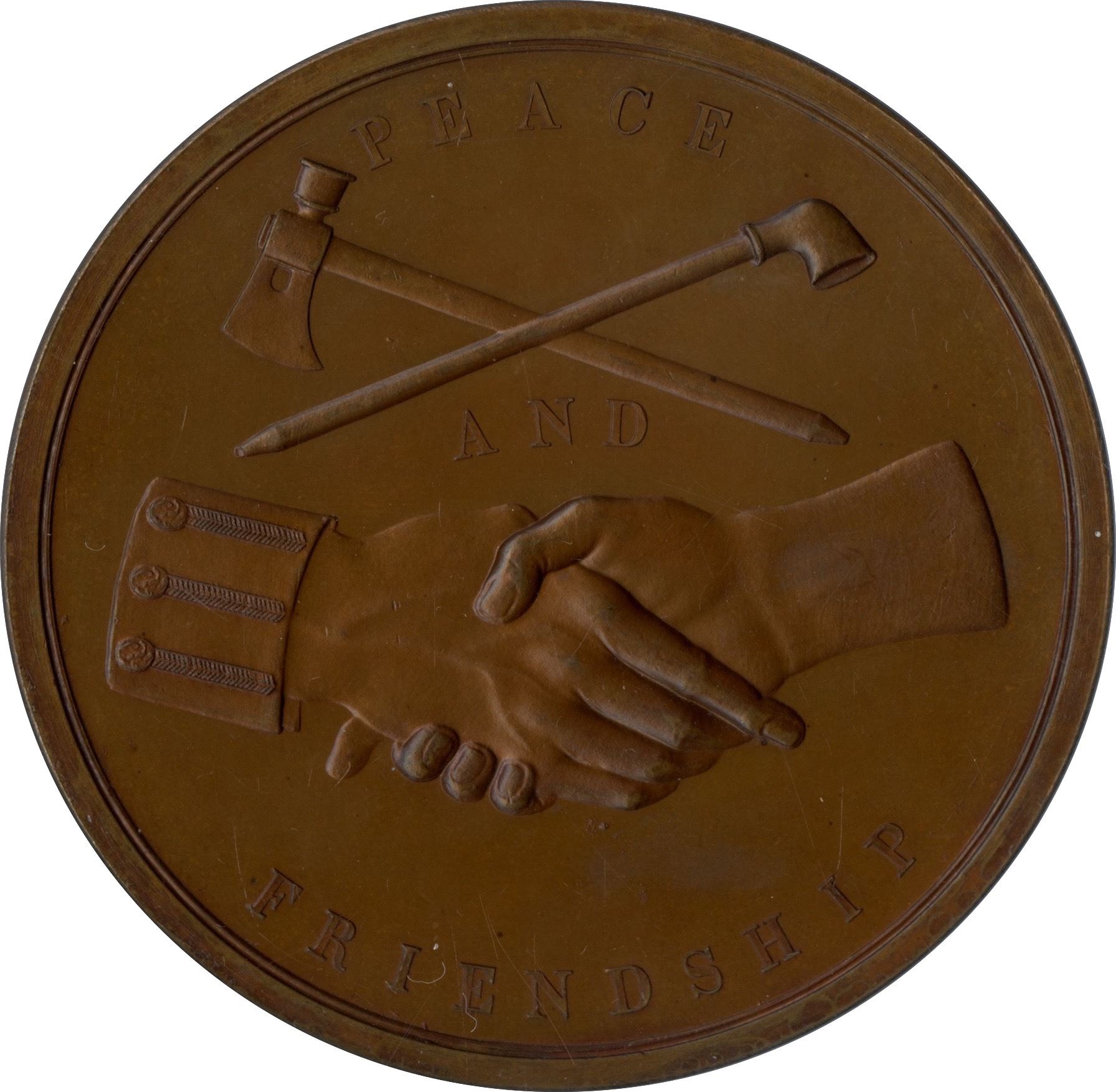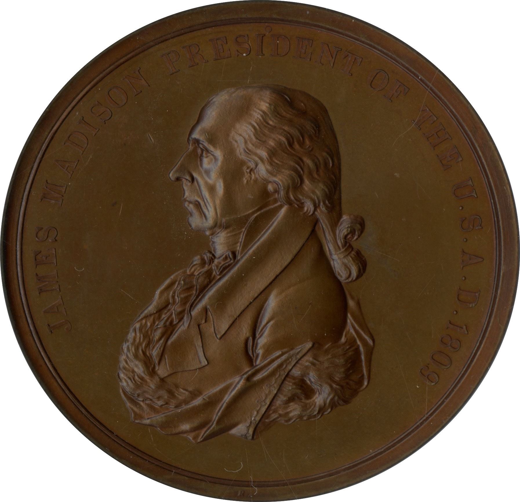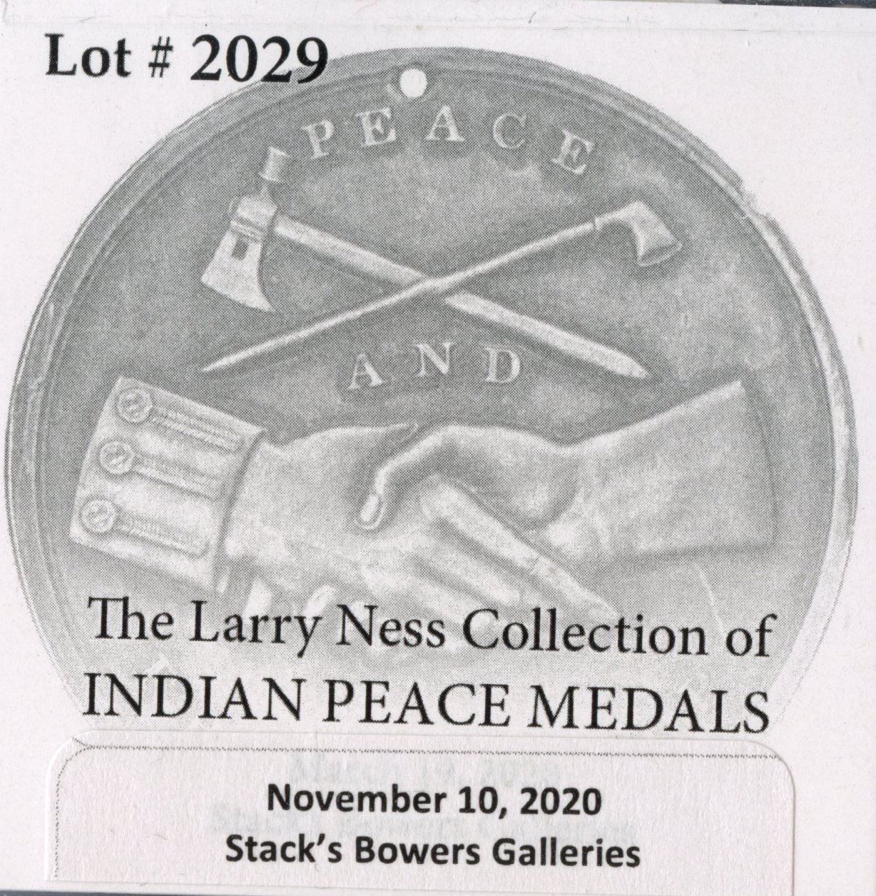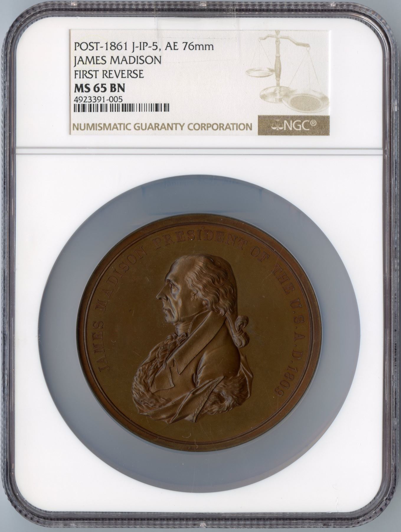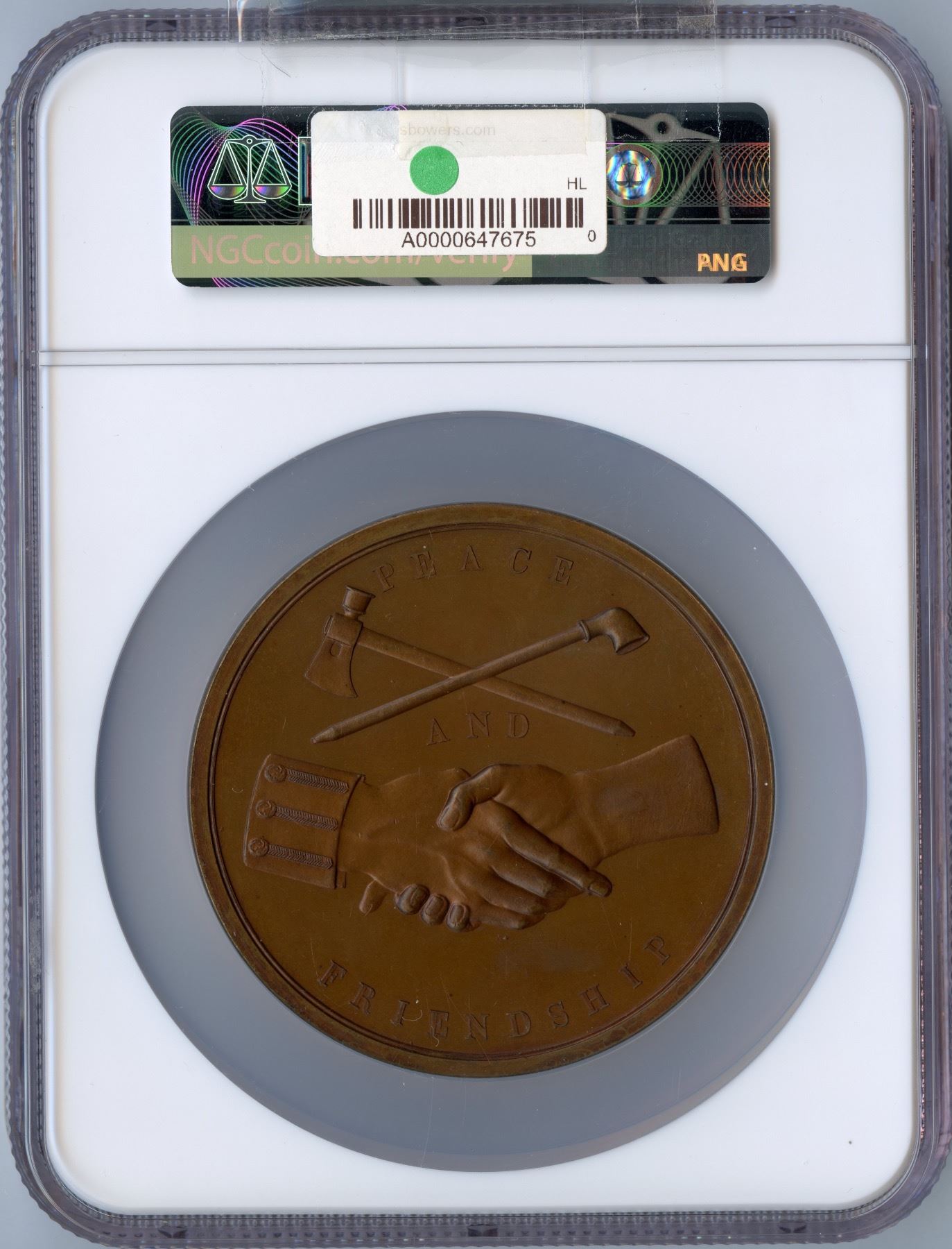 Bronze. First Size. First Reverse. Julian IP-5, Prucha-40. MS-65 BN (NGC). 75.9 mm. Lovely light olive brown with nuances of pale blue and gold in the reflective fields. Fine satin finish on the design motifs gives the piece pleasant visual contrast. A few tiny marks are scattered about, but there is none worthy of specific mention. Struck from the original dies used for the silver pieces, though in a later die state and refinished. Still, there are a few tiny shared die artifacts. On the obverse, a tiny raised bead may be seen close to the rim, just past the S of JAMES. On the reverse, there is a small lump on the lower left of the H in FRIENDSHIP, while double punching of the R and I of the same letter is plainly evident on both medals. Evidence of a later die state is found in a few scattered patches of light spalling including beneath the hands, left of the cuffed hand, in the field right of the axe head, and a few other places. John Reich’s “R.” mark on the obverse rim at 6:00. No collaring mark is noted. It is uncertain as to the date range when the bronzes were struck, but it was probably not in any significant number until the collector demand of 1860s. A special thanks to Stack's Bowers for the detailed description from The Larry Ness Collection of Indian Peace Medals, lot #2029 in the November 2020.