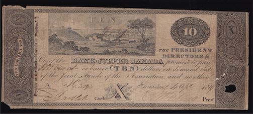 1819 Bank of Upper Canada Ten Dollars - CH 765-10-16. Hole and significant tear in lower right quadrant, small piece off lower left corner, otherwise VG, S/N: 3273.