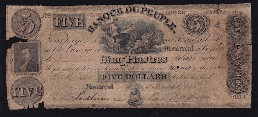 1835 Banque Du Peuple $5. CH 575-10-04-02. Good with several pieces missing. Rare. S/N:9273/A.