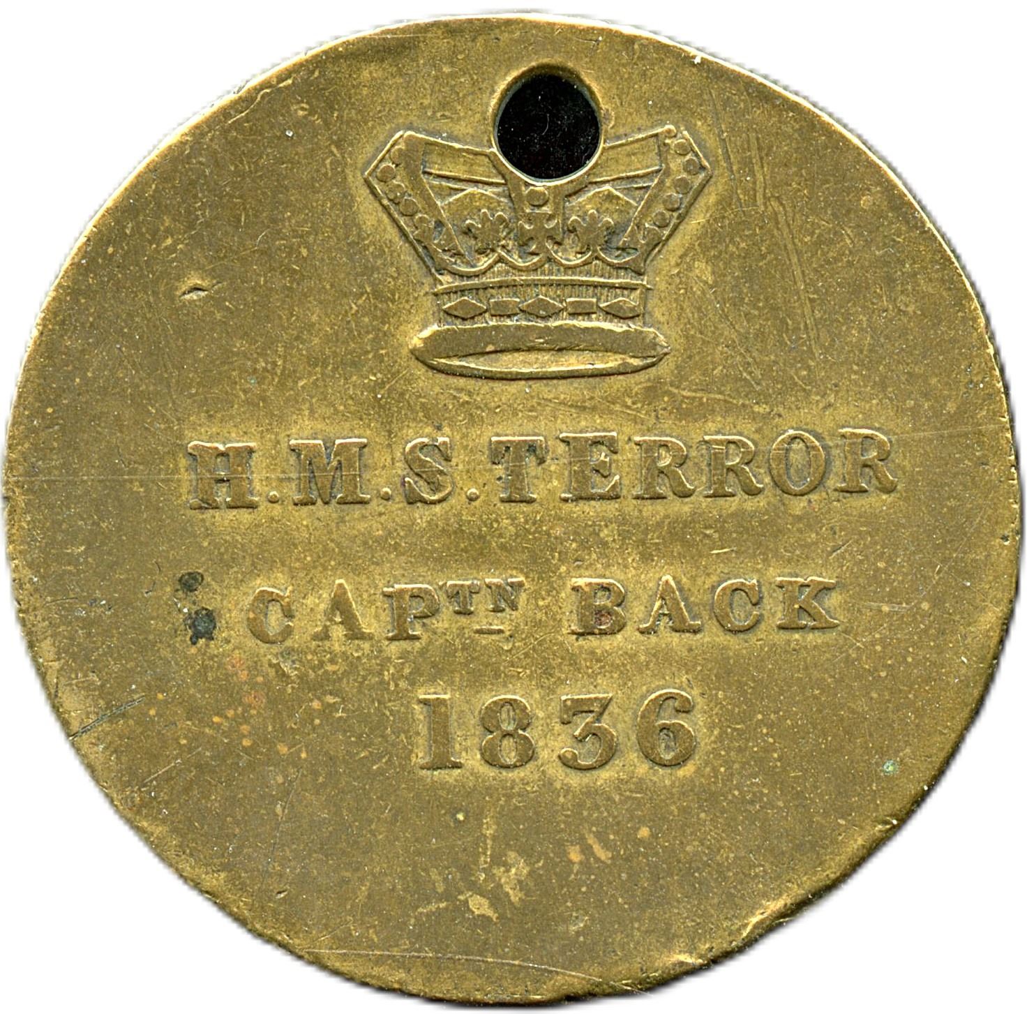 In 1836, command of HMS Terror was given to Captain George Back (1796-1878) for an Arctic expedition to Hudson Bay. The expedition aimed to enter Repulse Bay and send out landing parties to ascertain whether the Boothia Peninsula was an island or a peninsula. The ship was stranded for 118 days on an ice flow. The Royal Museums, Greenwich, UK, stated the Inuit had the hardiness to venture through challenging ice to the ship. The Inuit were given presents, supplied by the government, which included a few brass medals. The Ship survived the ice and sailed back to Ireland where it was fixed. 31mm, 10.7g, holed for suspension, VF. Ex. TCNC Torex Auction Feb. 2014 Sold for $2500, Rare, Perhaps the only example in private hands. From the Geoffrey Bell Collection.