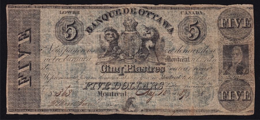 1837 Banque De Ottawa $5. CH 560-10-02, Fine, staple holes present, small glue dot on reverse. S/N:363.