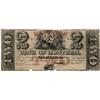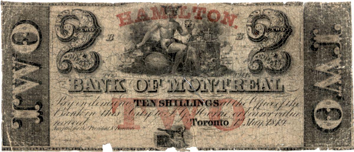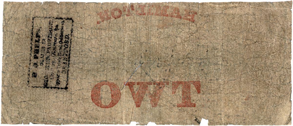 Toronto Issue. CH 505-24-04a. Red TWO protector, engraved date, red HAMILTON overprint across top centre. Rawdon, Wright, Hatch & Edson imprint. No signatures visible, nor sheet number; check letter is B. A presentable Good, with rough edges commensurate with the grade, and small pieces missing from bottom margin. Has a body tear about 3 cm long near the centre. There is a wonderful R.D. Phelps, Brantford, merchant's advertising stamp on the back, enhancing the historical value of this very rare note. Competition has recently become strong for early Bank of Montreal notes.