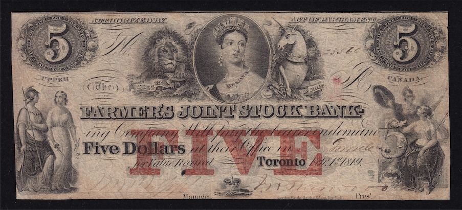1849 Farmer's Joint Stock Bank $5. CH 280-14-04-08, Fine, pinholes, S/N:23560/A.