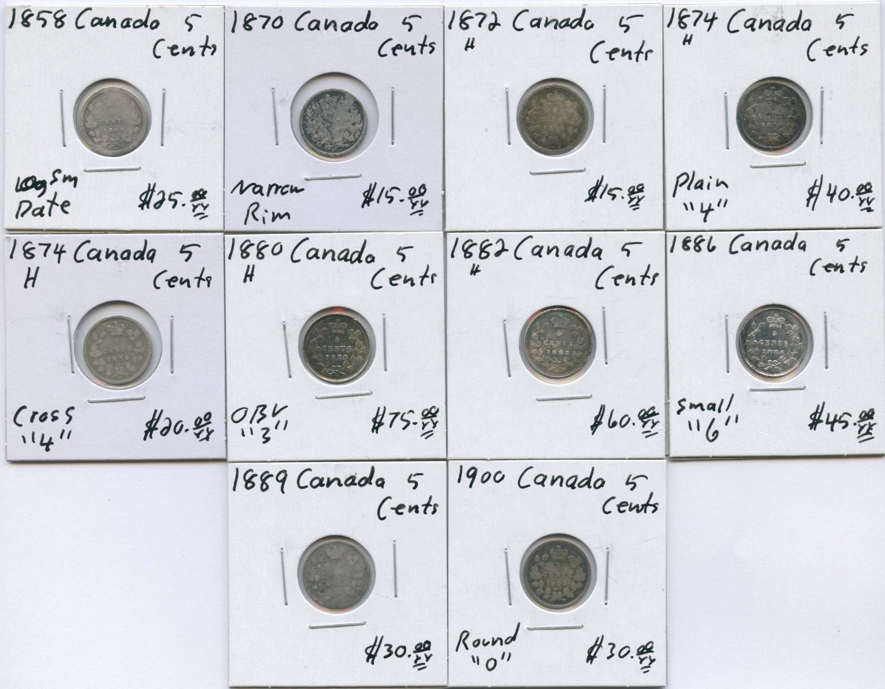 Dates include: 1858, 1870, 1872H, 1874H (plain 4), 1874H (Crosslet 4), 1880H, 1882H, 1886, 1889, 1900. 10 pcs.