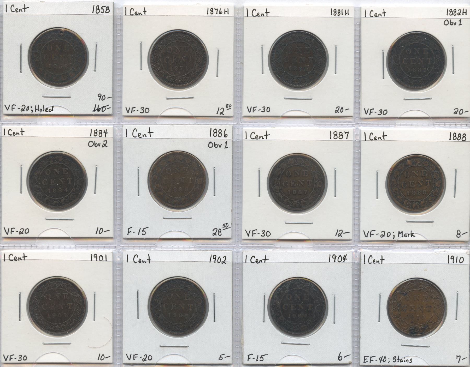 1858 VF-20 Holed, 1876H, 1881H, 1882H Obv 1, 1884 Obv 2, 1886 Obv 1, 1887, 1888, 1901, 1902, 1904 and 1910. Various grades, only the 1858 has problems. 12 Pcs.