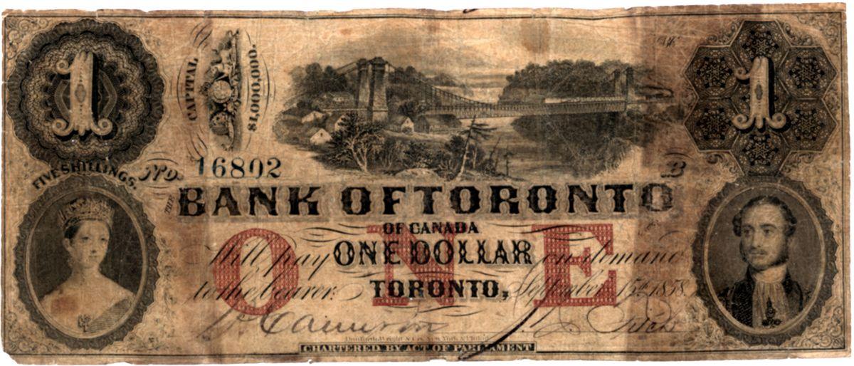 Altered from International Bank of Canada. CH 715-28-01. Red Protector, S/N 16802/B. Signatures A. Cameron - J.C. Fitch. A somewhat stained VG, several pinholes at left, and a small piece off lower left corner. An elusive note and seldom seen any better.