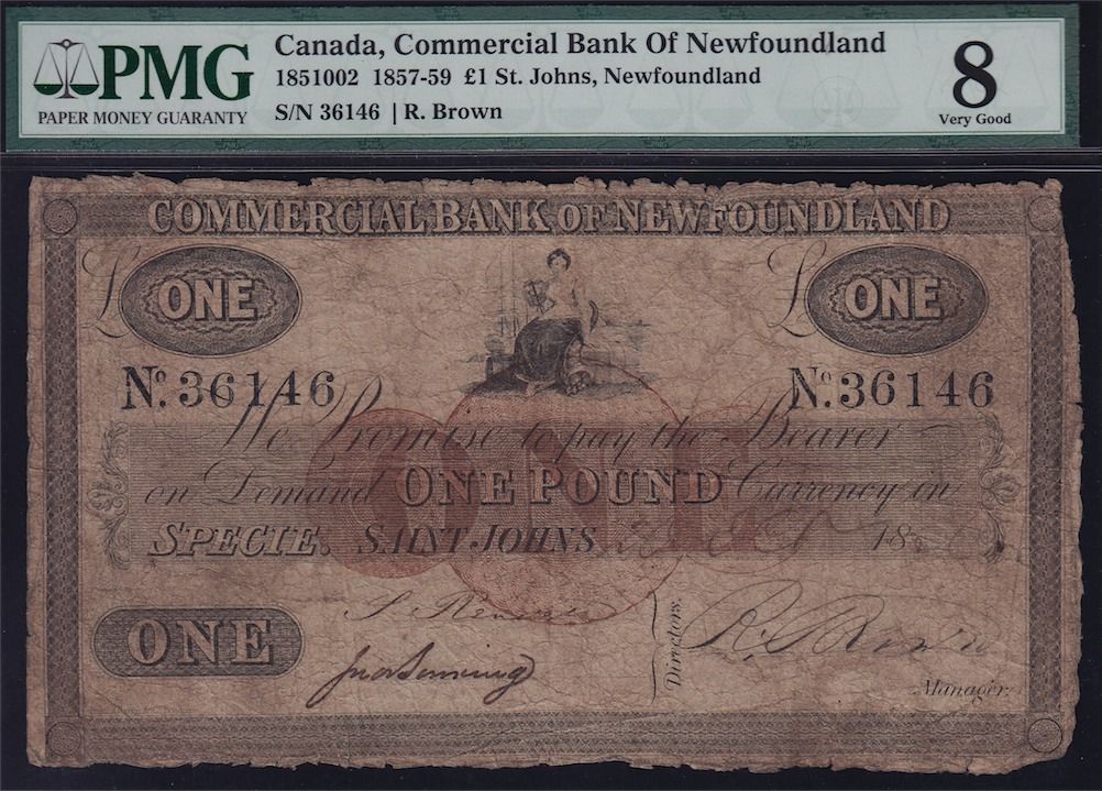 1858 Commercial Bank of Newfoundland £1 - CH 185-10-02 PMG VG 8. Awesome Large Size Note. Rarely seen with 2 known, the other is in an institutional collection. S/N 36146. Ex:Cameron.
