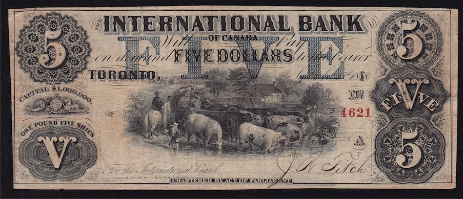 1858 International Bank $5. CH 380-10-14-16 VF, few pin holes. T. Squires, Broker, Albany, N.Y. on back. S/N:4621/A.