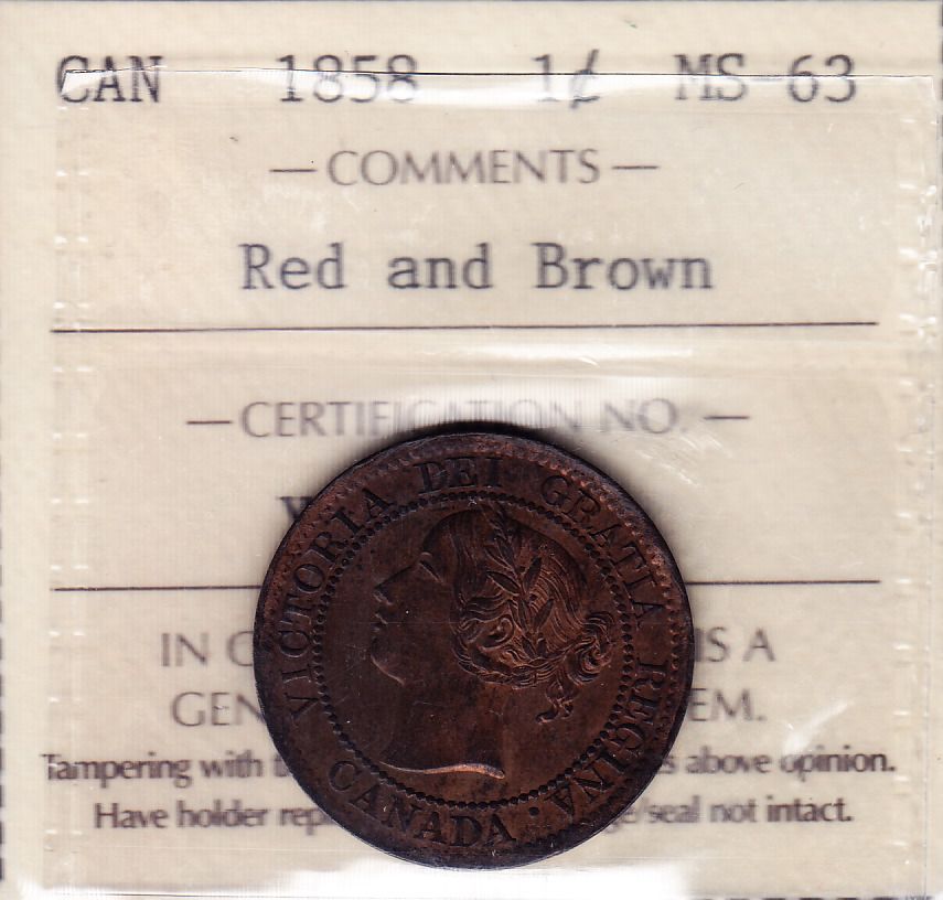 1858 One Cent - ICCS MS-63 Red & Brown.