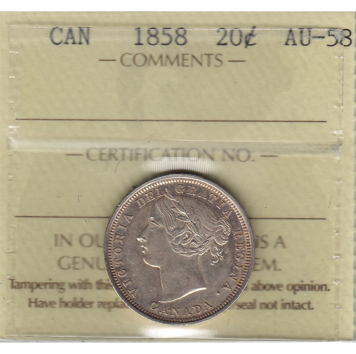 1858 Twenty Cent ICCS AU-58.