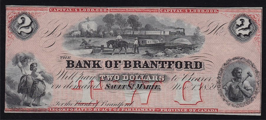 1859 Bank of Brantford $2 with Centre Vignette. CH 40-12-04R, The usual pink remainder of 1859, an uncirculated $2 with the large central vignette. Nice display piece.