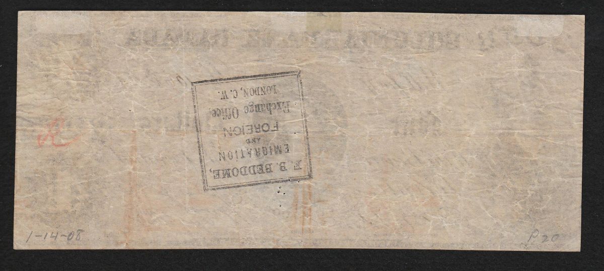 Cat #130-10-02-08 Fine+ Condition, pin holes are present as well as hinges. Two signatures. F.B. Beddome Emigration and Foreign Exchange, London stamped on reverse. S/N 1068