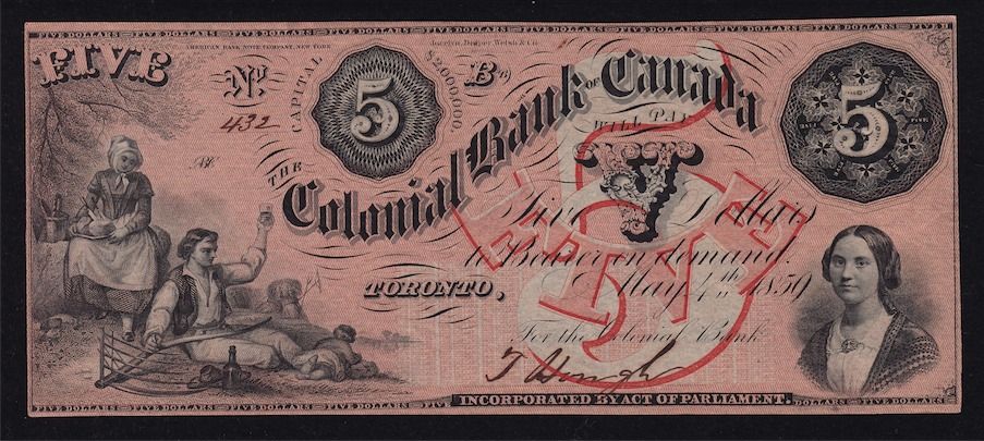 1859 Colonial Bank of Canada $5. CH 130-10-04-10, one signature, UNC, light hinge mark on back. S/N:432/B.