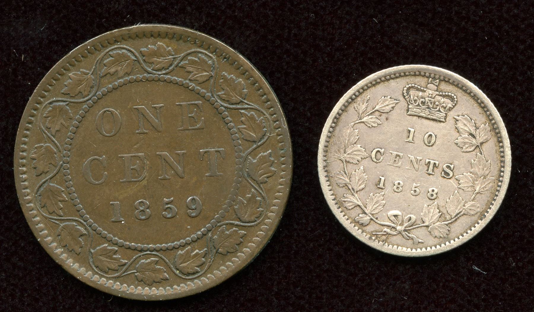 1859 One Cent, Wide 9, Medal Alignment, F/VF; 1858 10 Cents, VF. 2 Pcs.