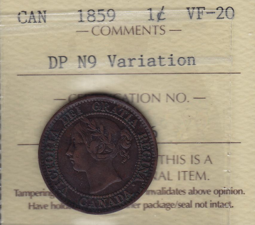 1859 One Cent - ICCS VF-20 DP N9 Variety.
