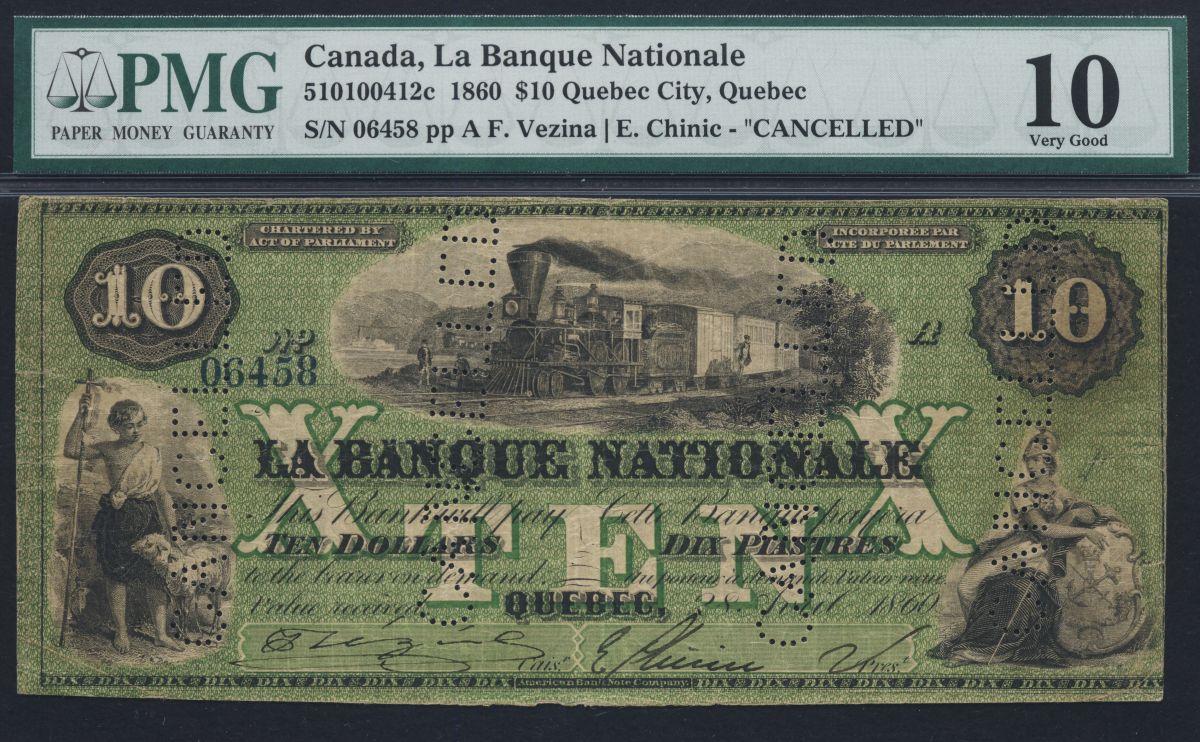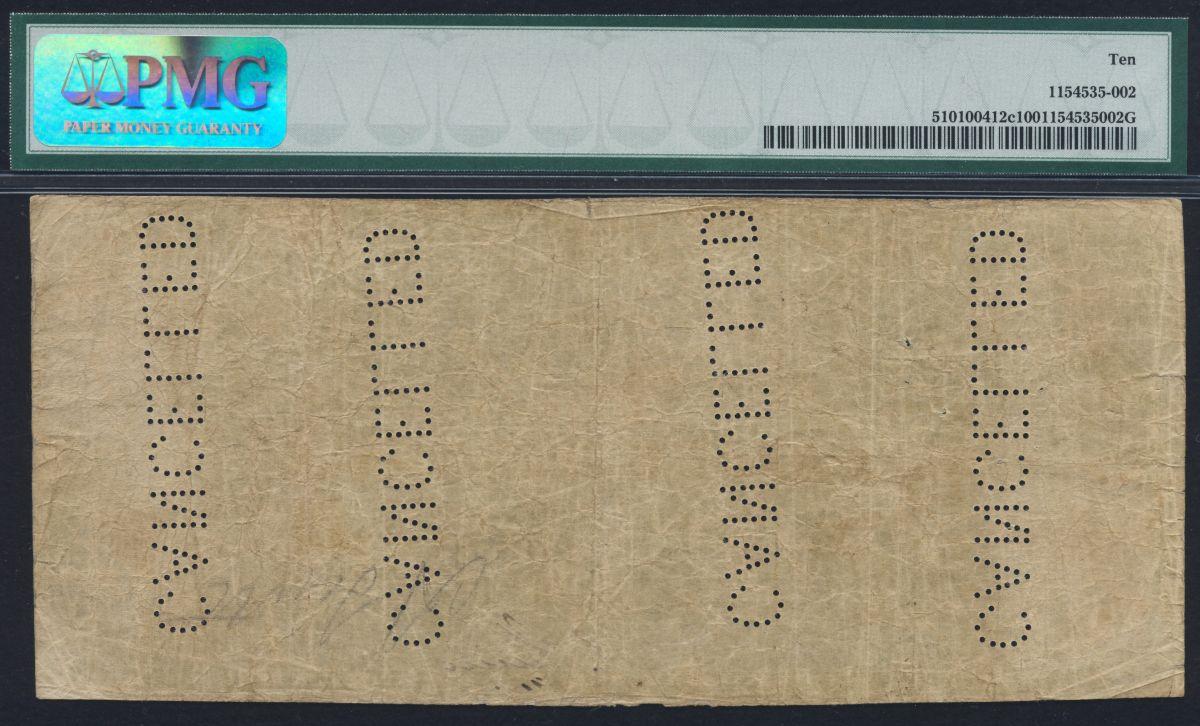 CH 510-10-04-12. PMG Graded VG10. Small edge tear on top center margin. Gorgeous Train Vignette. Note has been punched cancelled. Only 10 recorded. S/N 06458/A