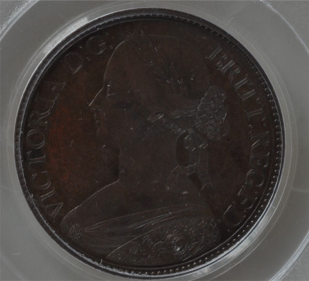 1861 Nova Scotia One Cent Pattern - CH NS-4, PCGS SP65 RB. Bronze, 4.69 grams. Large bust of Victoria by James Wyon. Superb Strike, date below wreath on reverse. Traces of lustre in the legends. Very rare with only 8 graded by PCGS. Ex:Temple.